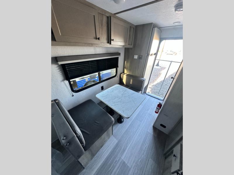 Pack your bags and load up this travel trailer for a great camping trip! You will have everything you need to keep your belly full with the two burner cooktop, your hair clean with a tub inside rear corner bathroom which also has a power vent fan, and your body well rested after sleeping on the front bed. You can even play card games at the booth dinette or transform it into an extra sleeping space. There is also an outside shower to rinse the mud off your feet before entering inside!