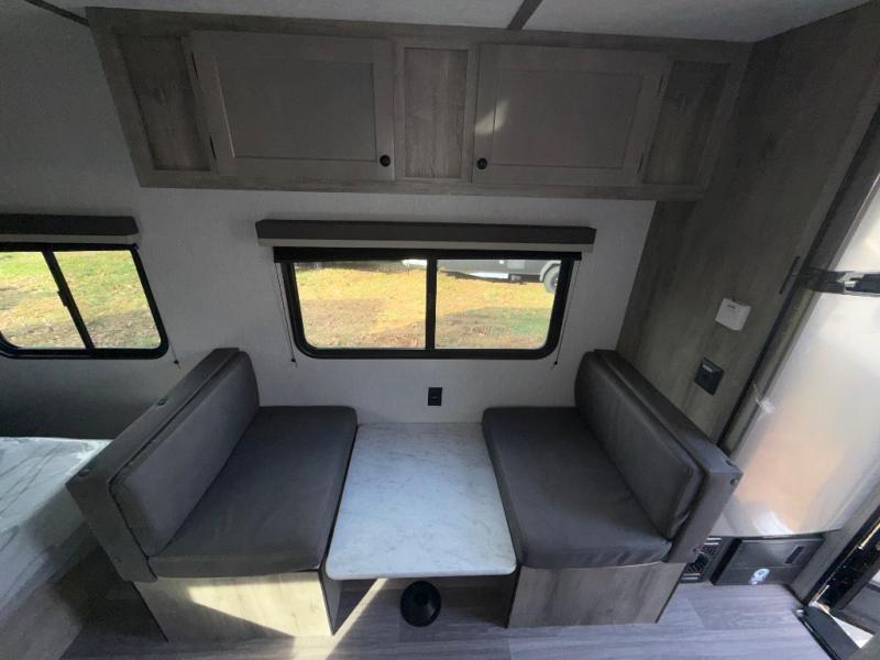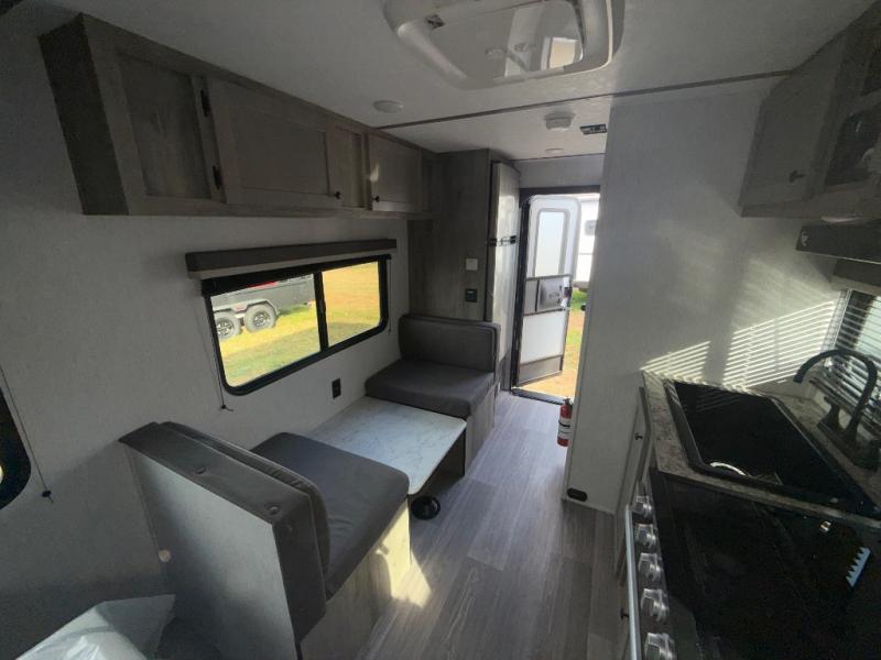 Pack your bags and load up this travel trailer for a great camping trip! You will have everything you need to keep your belly full with the two burner cooktop, your hair clean with a tub inside rear corner bathroom which also has a power vent fan, and your body well rested after sleeping on the front bed. You can even play card games at the booth dinette or transform it into an extra sleeping space. There is also an outside shower to rinse the mud off your feet before entering inside!