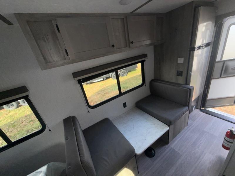 Pack your bags and load up this travel trailer for a great camping trip! You will have everything you need to keep your belly full with the two burner cooktop, your hair clean with a tub inside rear corner bathroom which also has a power vent fan, and your body well rested after sleeping on the front bed. You can even play card games at the booth dinette or transform it into an extra sleeping space. There is also an outside shower to rinse the mud off your feet before entering inside!