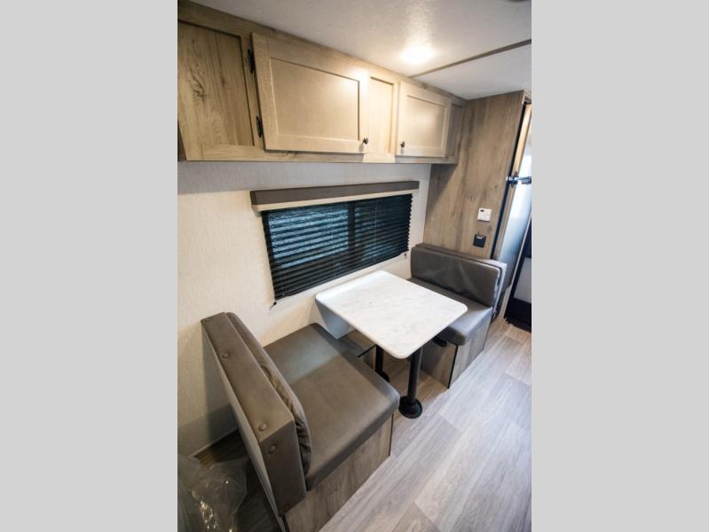 Pack your bags and load up this travel trailer for a great camping trip! You will have everything you need to keep your belly full with the two burner cooktop, your hair clean with a tub inside rear corner bathroom which also has a power vent fan, and your body well rested after sleeping on the front bed. You can even play card games at the booth dinette or transform it into an extra sleeping space. There is also an outside shower to rinse the mud off your feet before entering inside!
