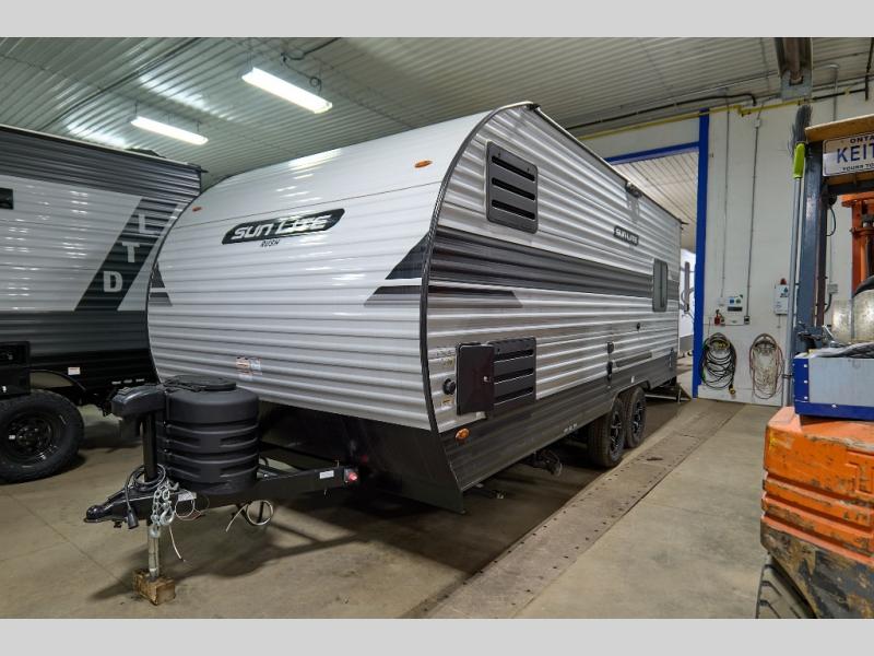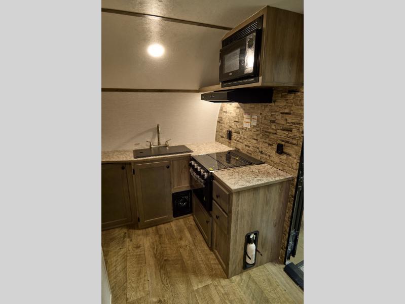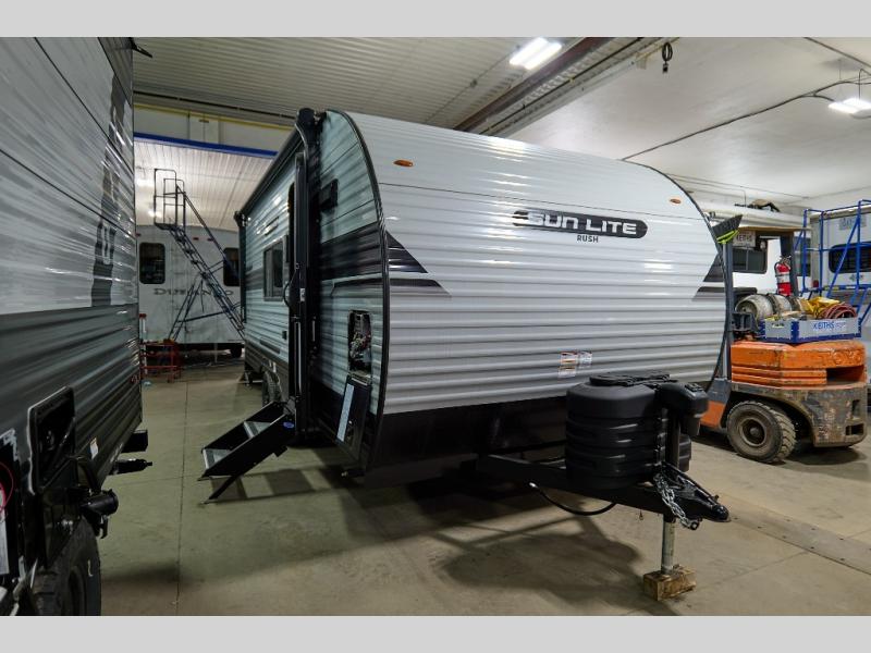 You can trust the build and enjoy your experience with any one of these Sunset Park RV Sun Lite travel trailers or toy haulers! Their aerodynamic profile is not only easy to haul, but also saves on fuel. They are built to withstand years of traveling even though they are lightweight with a diamond plate rock guard, a one piece PVC roof membrane, Dexter Spring-Leaf axles, and tinted safety glass windows. Some comfort standards you are sure to enjoy are the two-burner stove top range with hood, light and fan, plus the refrigerator and microwave, and an outside shower to help keep the dirt outdoors where it belongs.