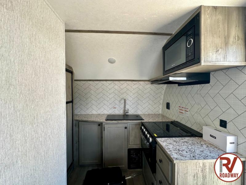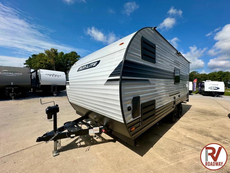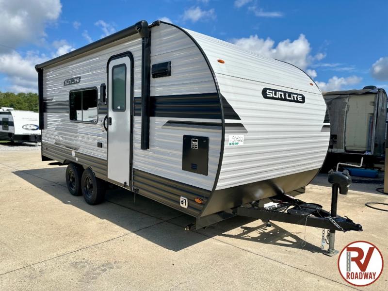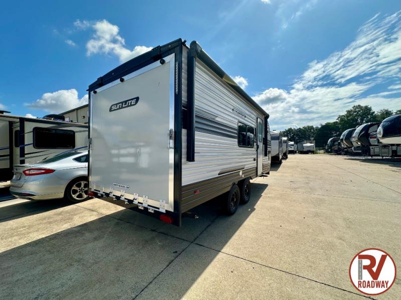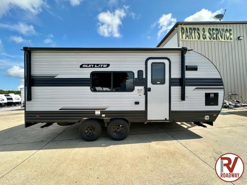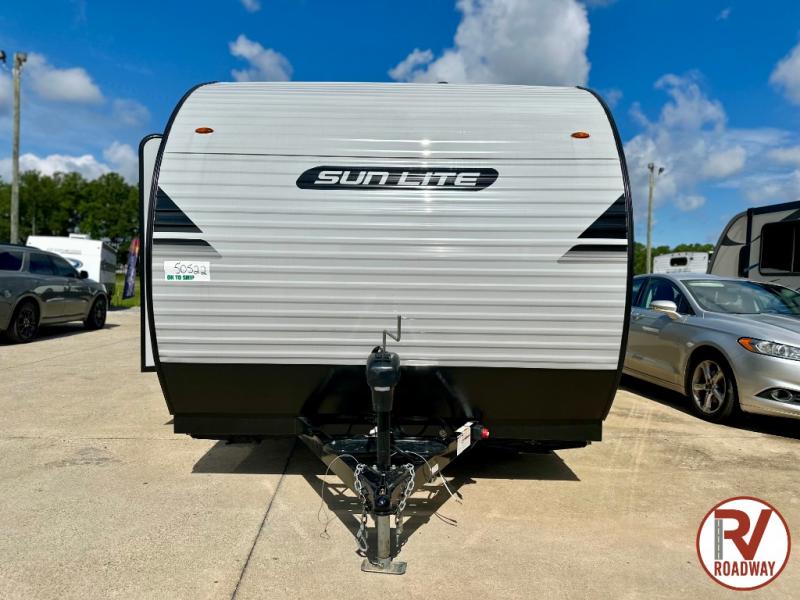 You can trust the build and enjoy your experience with any one of these Sunset Park RV Sun Lite travel trailers or toy haulers! Their aerodynamic profile is not only easy to haul, but also saves on fuel. They are built to withstand years of traveling even though they are lightweight with a diamond plate rock guard, a one piece PVC roof membrane, Dexter Spring-Leaf axles, and tinted safety glass windows. Some comfort standards you are sure to enjoy are the two-burner stove top range with hood, light and fan, plus the refrigerator and microwave, and an outside shower to help keep the dirt outdoors where it belongs.