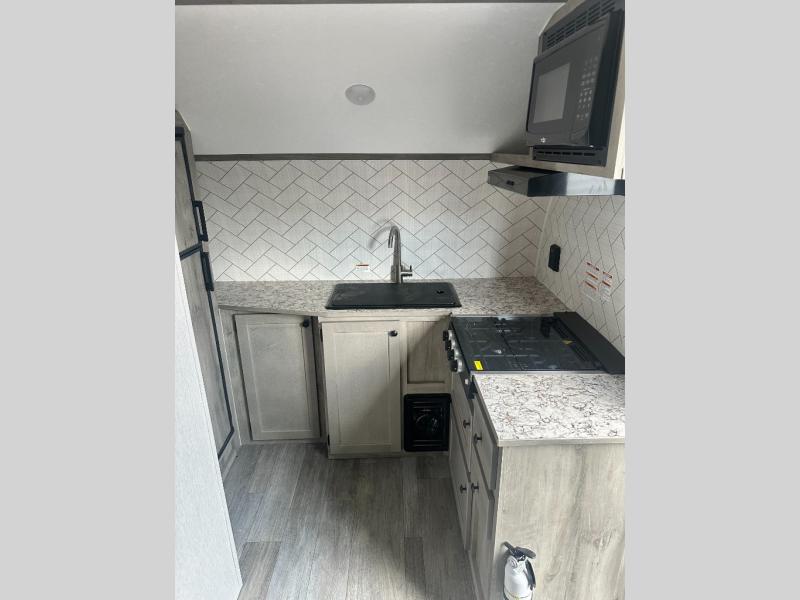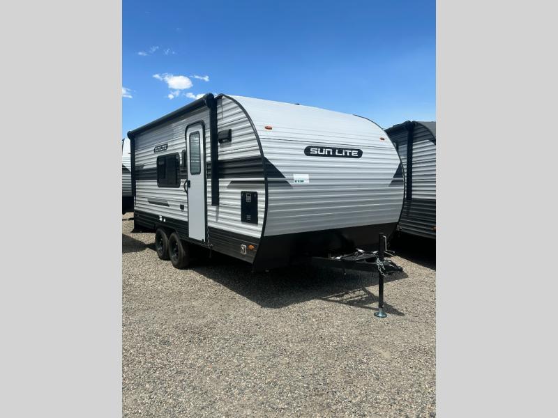 You can trust the build and enjoy your experience with any one of these Sunset Park RV Sun Lite travel trailers or toy haulers! Their aerodynamic profile is not only easy to haul, but also saves on fuel. They are built to withstand years of traveling even though they are lightweight with a diamond plate rock guard, a one piece PVC roof membrane, Dexter Spring-Leaf axles, and tinted safety glass windows. Some comfort standards you are sure to enjoy are the two-burner stove top range with hood, light and fan, plus the refrigerator and microwave, and an outside shower to help keep the dirt outdoors where it belongs.