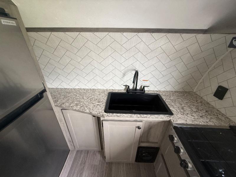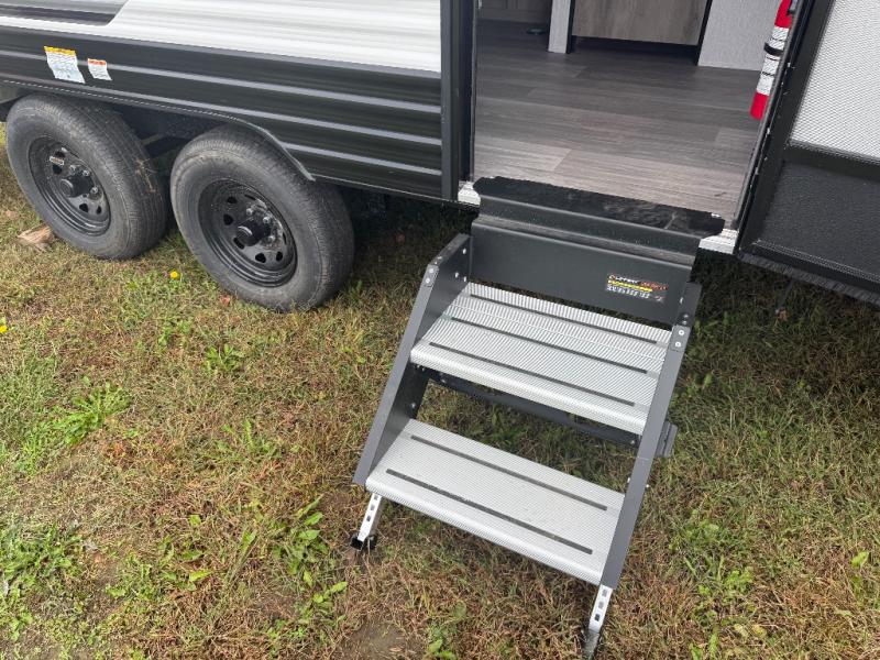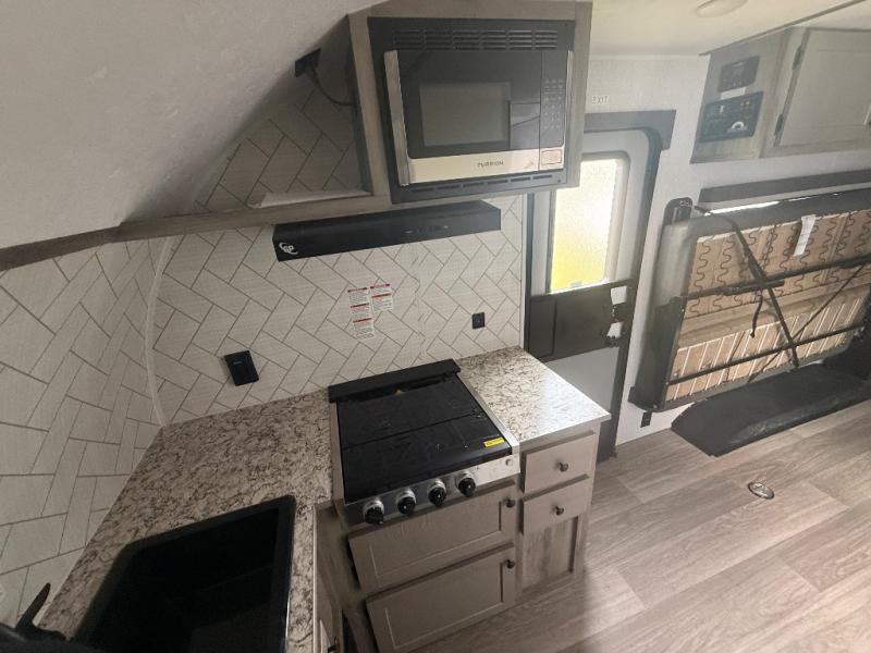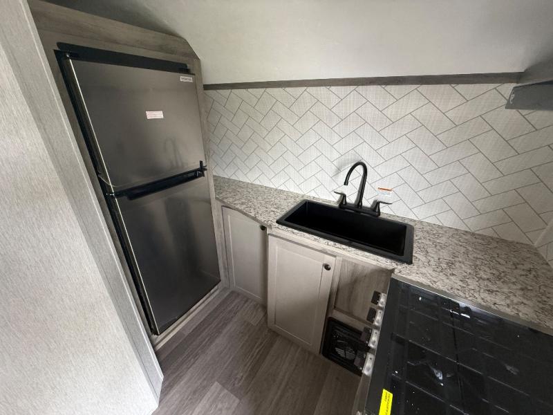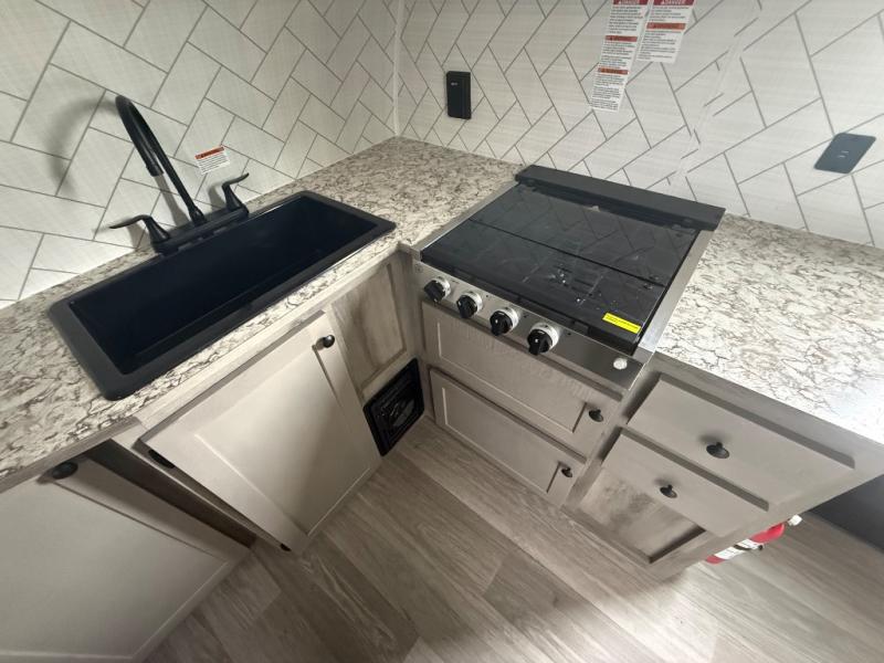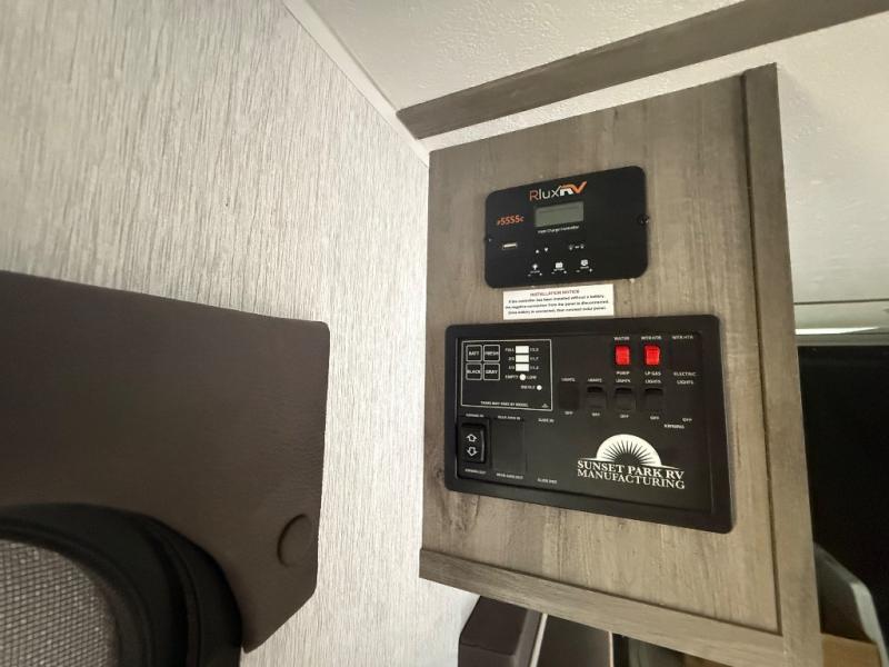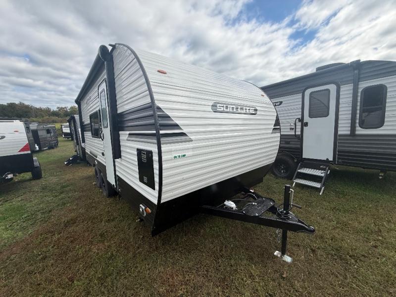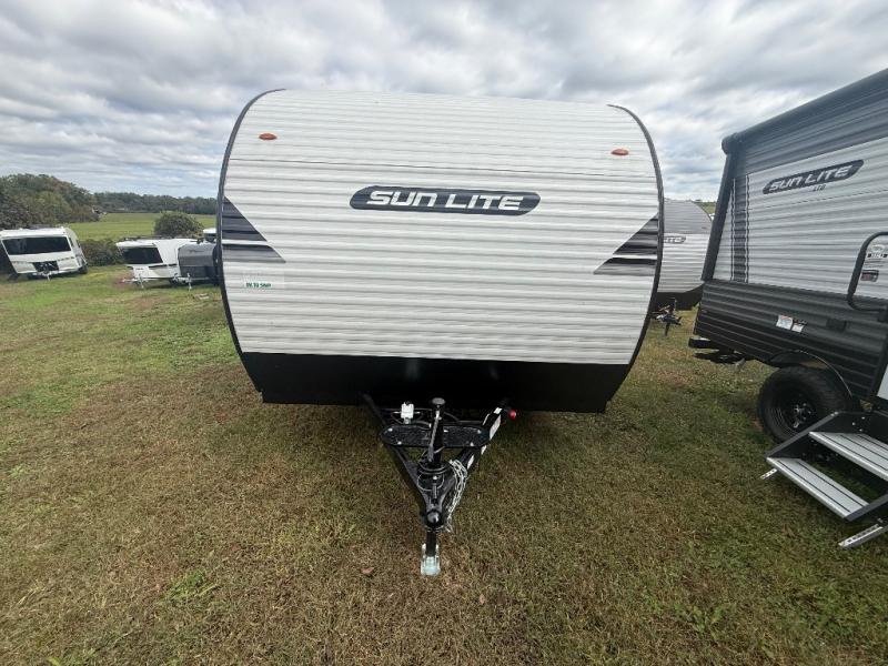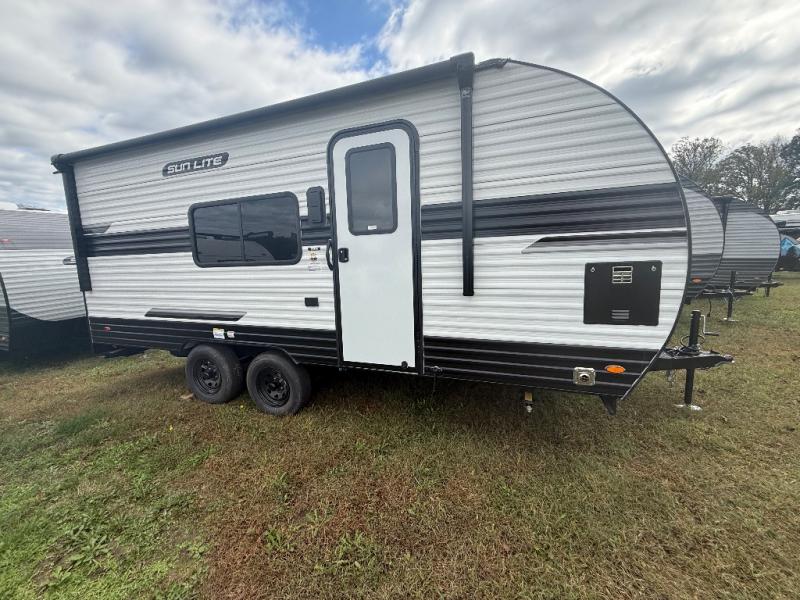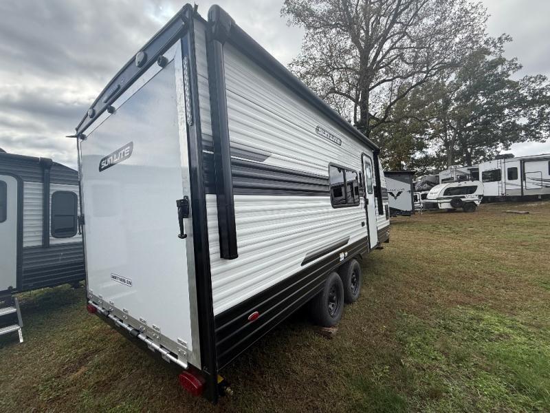 You can trust the build and enjoy your experience with any one of these Sunset Park RV Sun Lite travel trailers or toy haulers! Their aerodynamic profile is not only easy to haul, but also saves on fuel. They are built to withstand years of traveling even though they are lightweight with a diamond plate rock guard, a one piece PVC roof membrane, Dexter Spring-Leaf axles, and tinted safety glass windows. Some comfort standards you are sure to enjoy are the two-burner stove top range with hood, light and fan, plus the refrigerator and microwave, and an outside shower to help keep the dirt outdoors where it belongs.