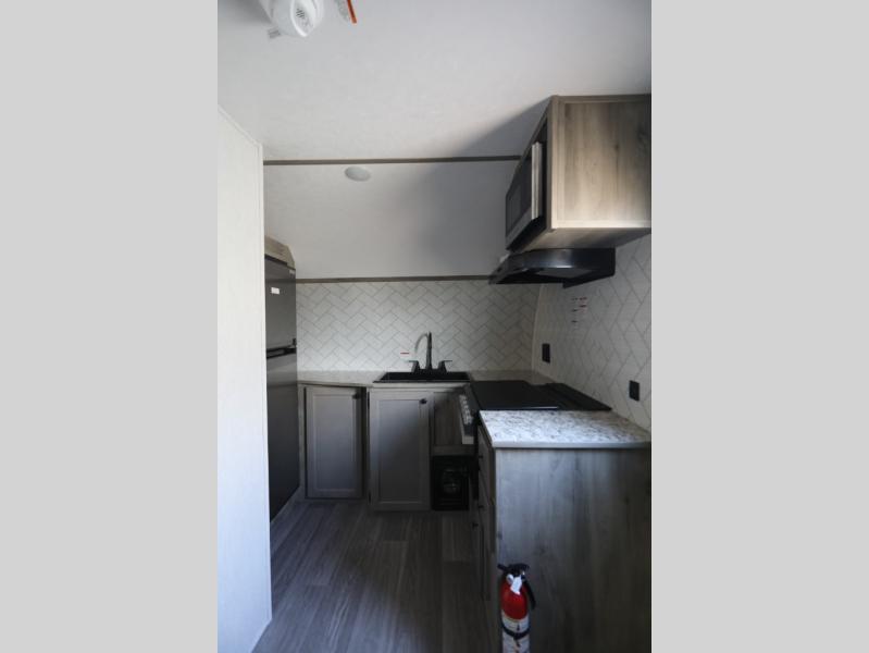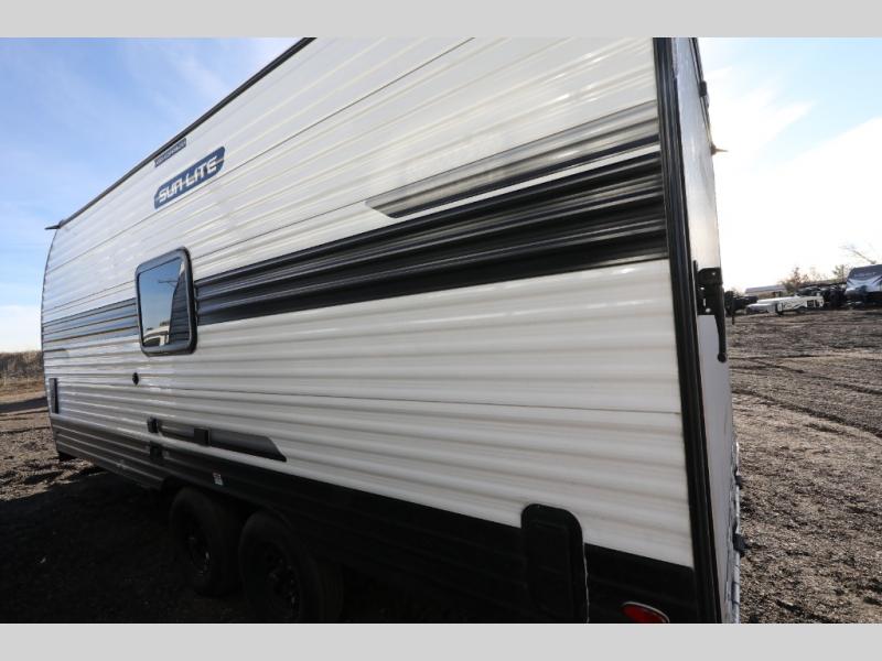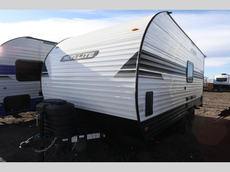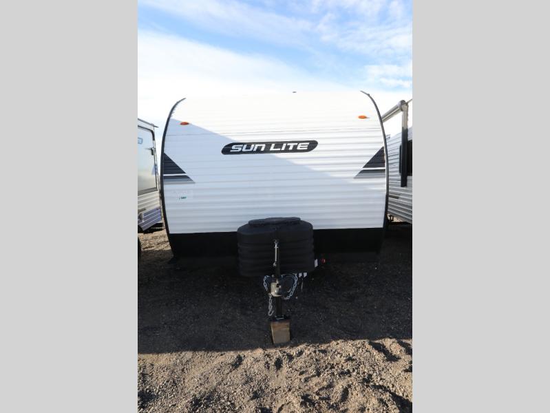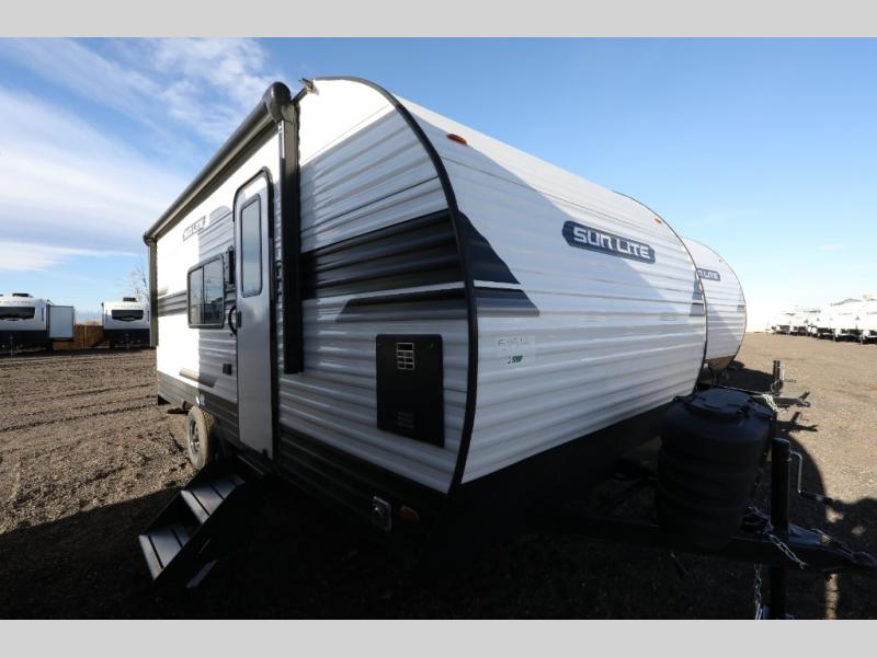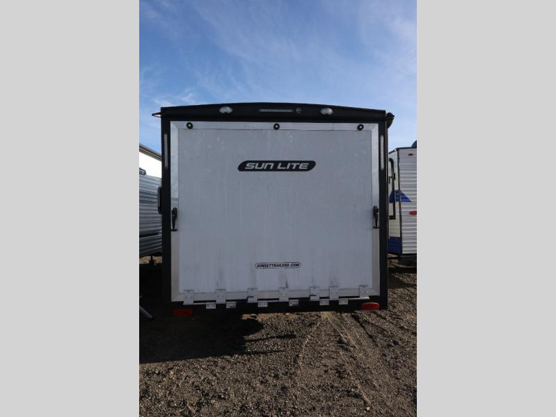 You can trust the build and enjoy your experience with any one of these Sunset Park RV Sun Lite travel trailers or toy haulers! Their aerodynamic profile is not only easy to haul, but also saves on fuel. They are built to withstand years of traveling even though they are lightweight with a diamond plate rock guard, a one piece PVC roof membrane, Dexter Spring-Leaf axles, and tinted safety glass windows. Some comfort standards you are sure to enjoy are the two-burner stove top range with hood, light and fan, plus the refrigerator and microwave, and an outside shower to help keep the dirt outdoors where it belongs.