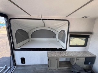 Get ready for a great camping experience where you can take along your favorite ride-on toys, kayaks, or other items that you may not normally have room to load as this toy hauler features 13' 2" of cargo space that can easily be loaded using the rear ramp door. Once unloaded, set up with the fold-down bed that will make for a great night's rest. There is also a jiffy sofa that can transform into added sleeping space at night. The kitchen amenities will make it easy to create a warm meal, and you can get cleaned up and refreshed in the bathroom with tub/shower and toilet. And when the optional tent bed is added on this model, you can sleep more campers!