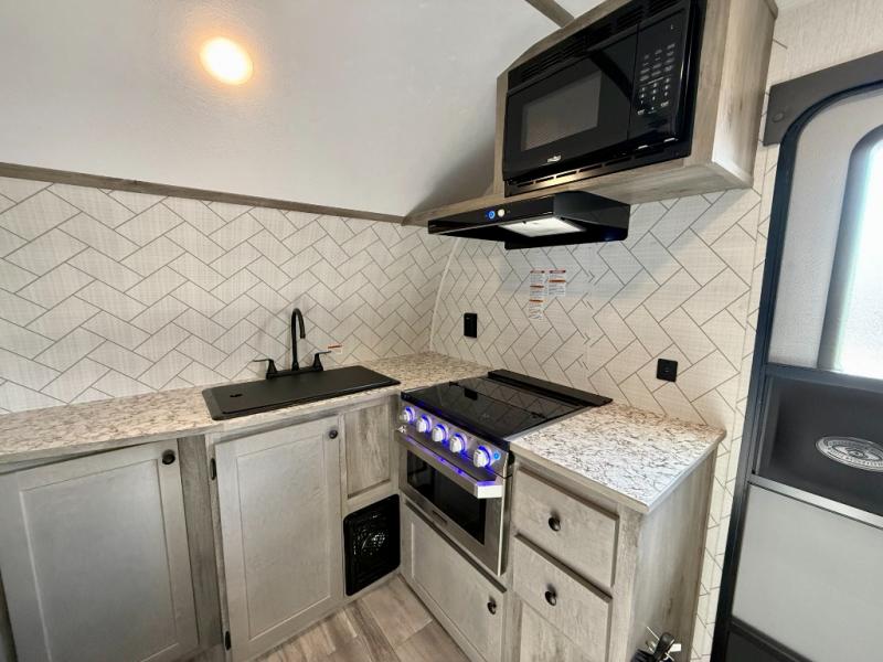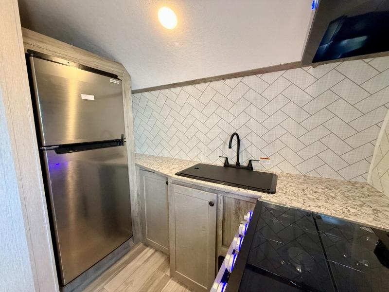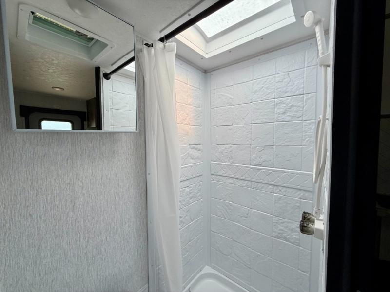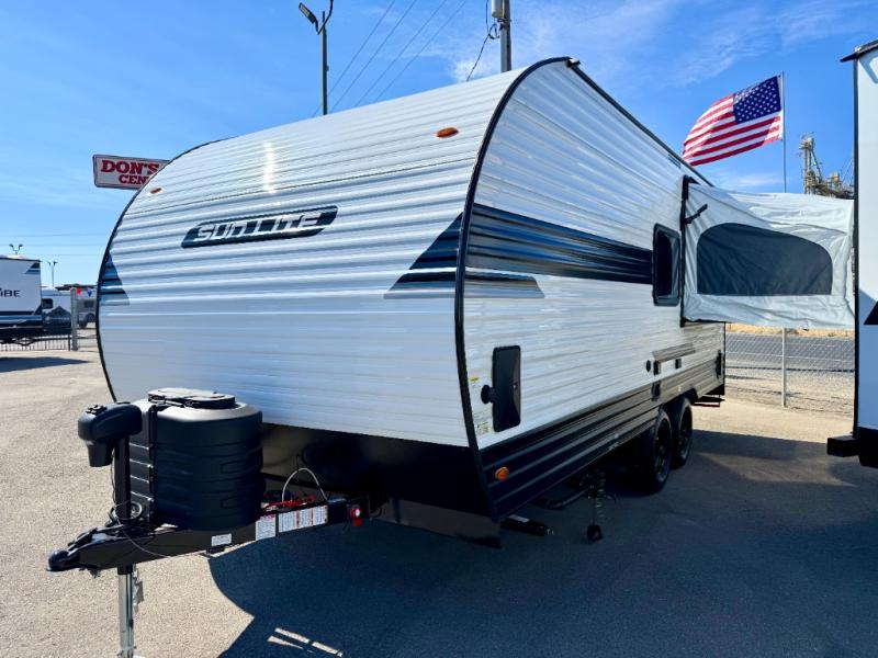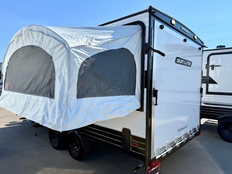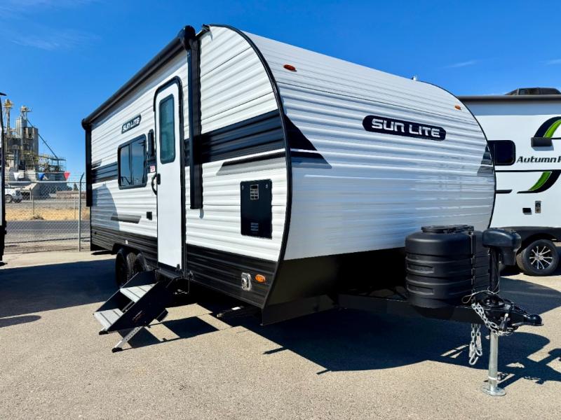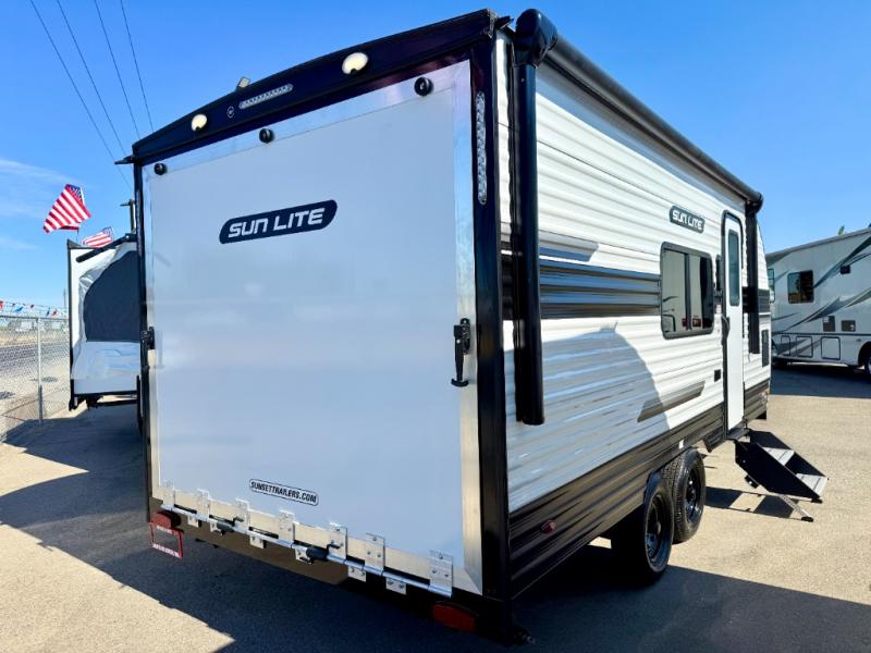 You can trust the build and enjoy your experience with any one of these Sunset Park RV Sun Lite travel trailers or toy haulers! Their aerodynamic profile is not only easy to haul, but also saves on fuel. They are built to withstand years of traveling even though they are lightweight with a diamond plate rock guard, a one piece PVC roof membrane, Dexter Spring-Leaf axles, and tinted safety glass windows. Some comfort standards you are sure to enjoy are the two-burner stove top range with hood, light and fan, plus the refrigerator and microwave, and an outside shower to help keep the dirt outdoors where it belongs.