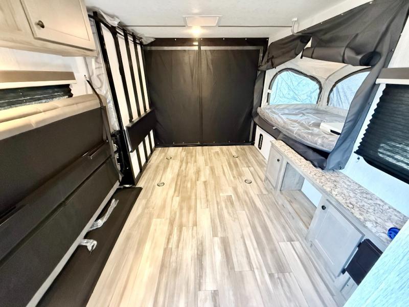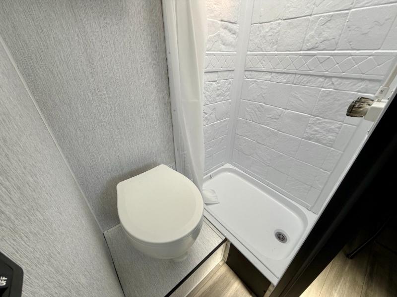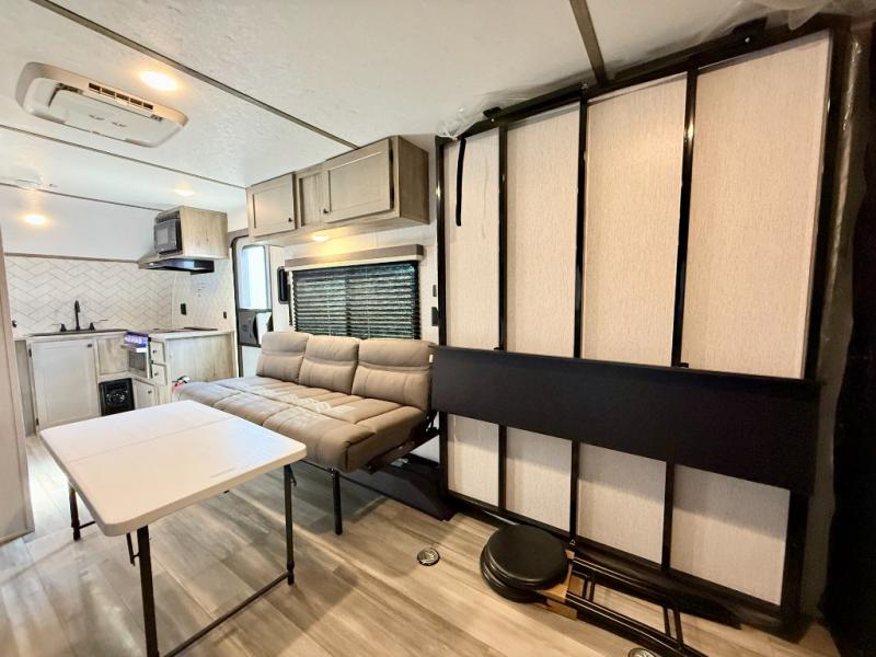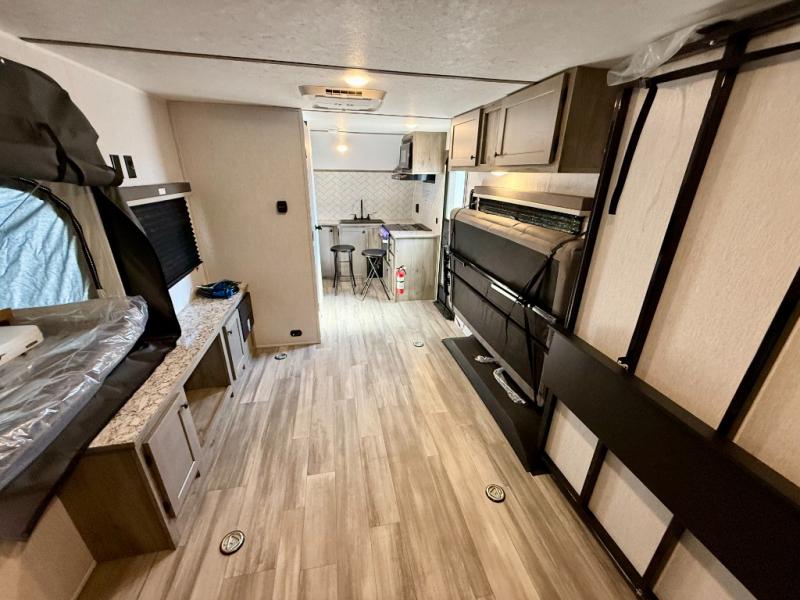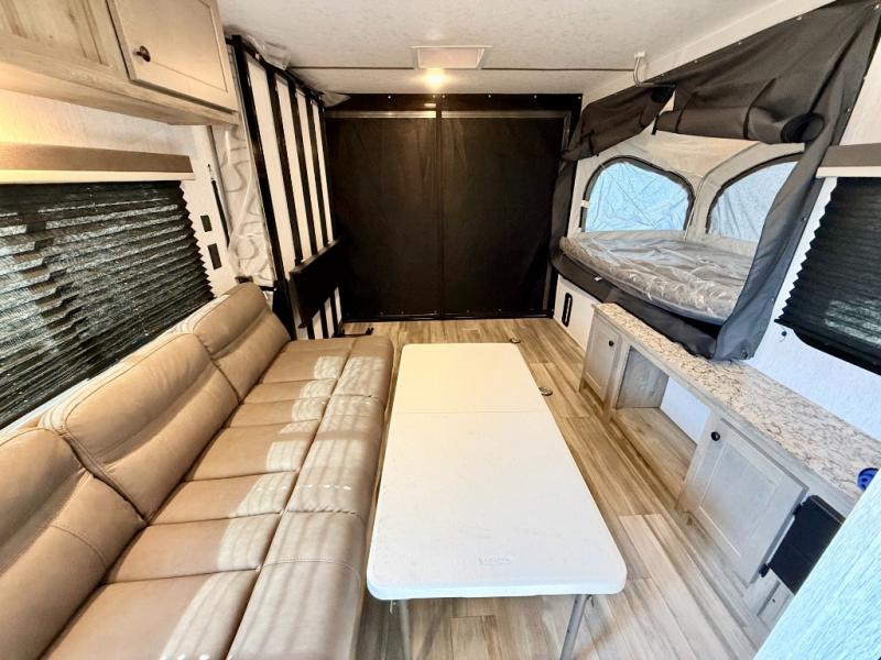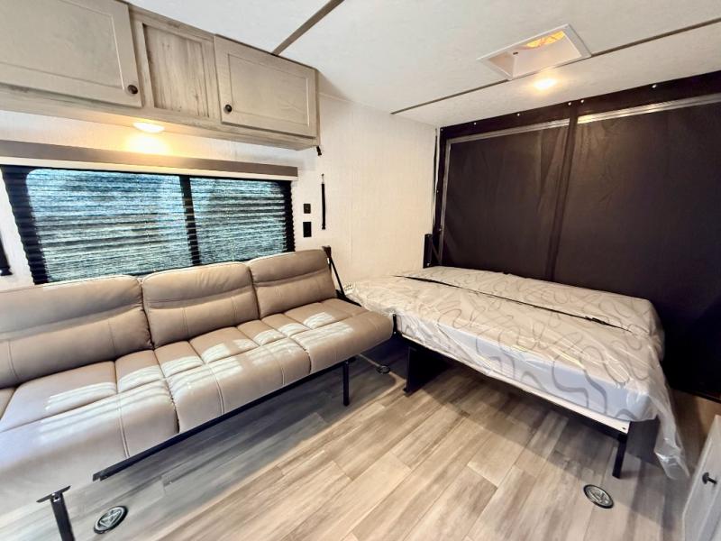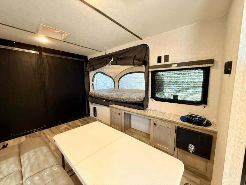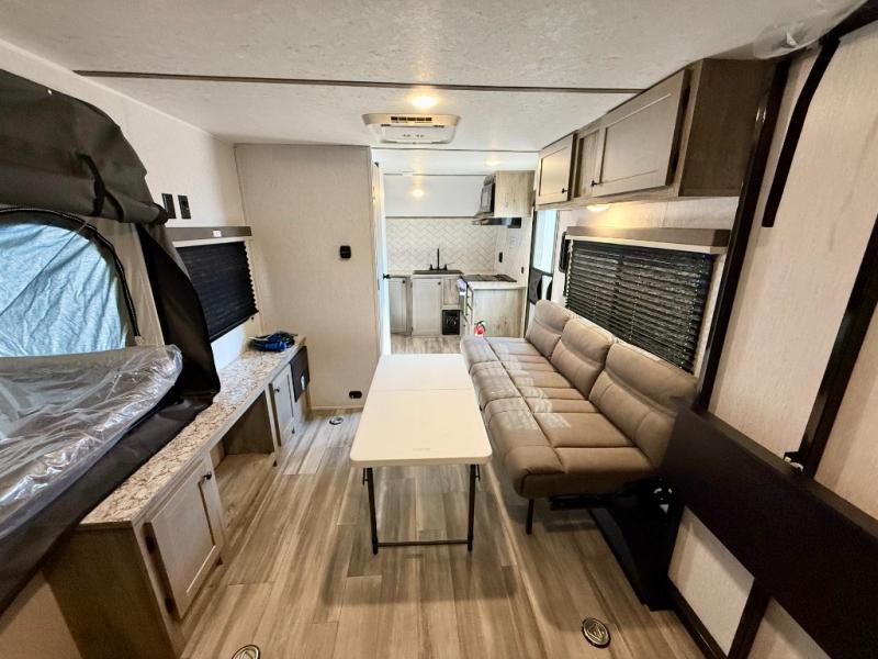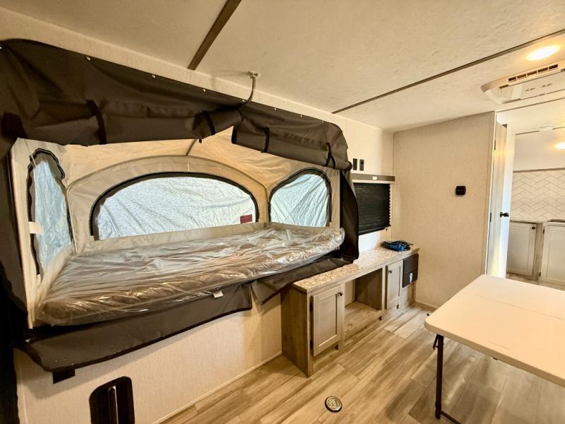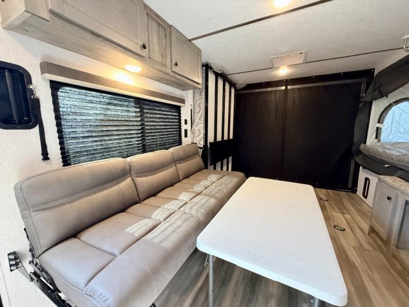Get ready for a great camping experience where you can take along your favorite ride-on toys, kayaks, or other items that you may not normally have room to load as this toy hauler features 13' 2" of cargo space that can easily be loaded using the rear ramp door. Once unloaded, set up with the fold-down bed that will make for a great night's rest. There is also a jiffy sofa that can transform into added sleeping space at night. The kitchen amenities will make it easy to create a warm meal, and you can get cleaned up and refreshed in the bathroom with tub/shower and toilet. And when the optional tent bed is added on this model, you can sleep more campers!