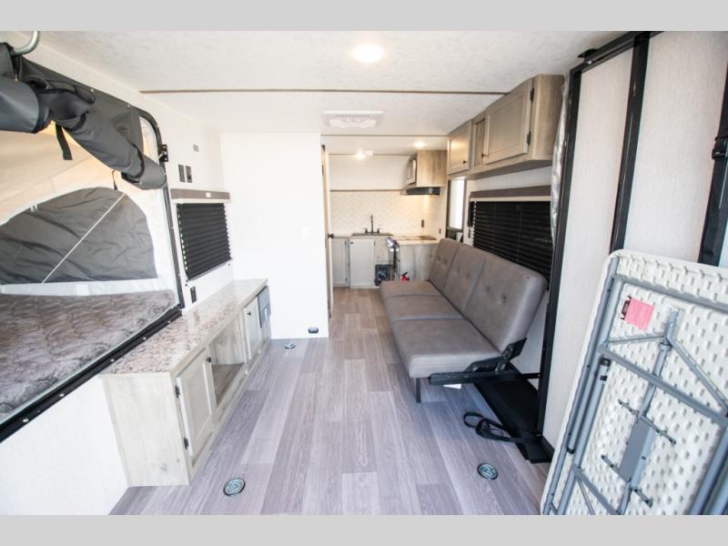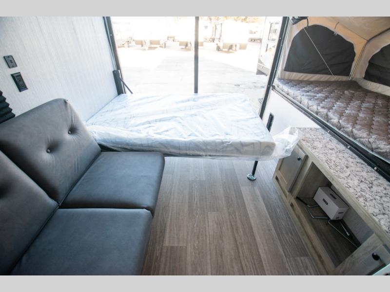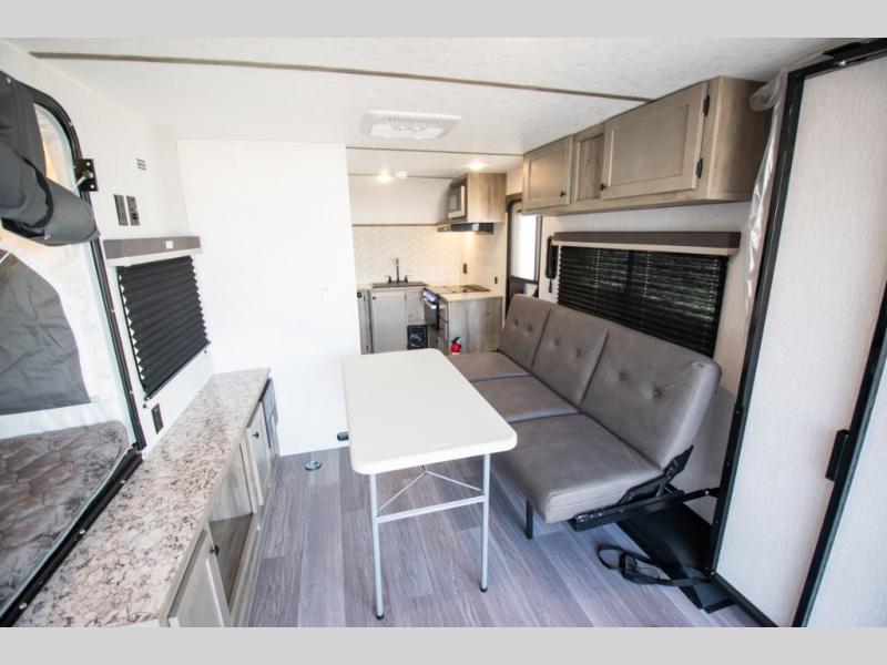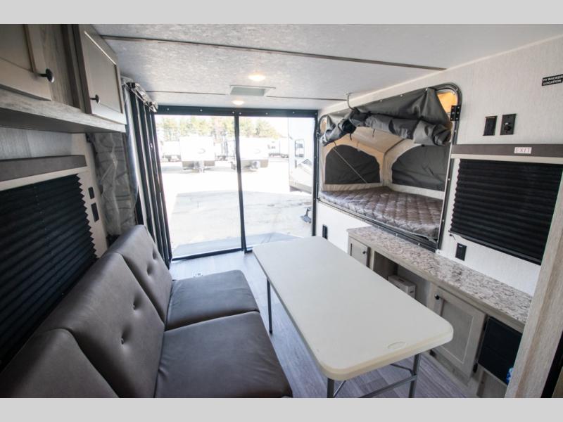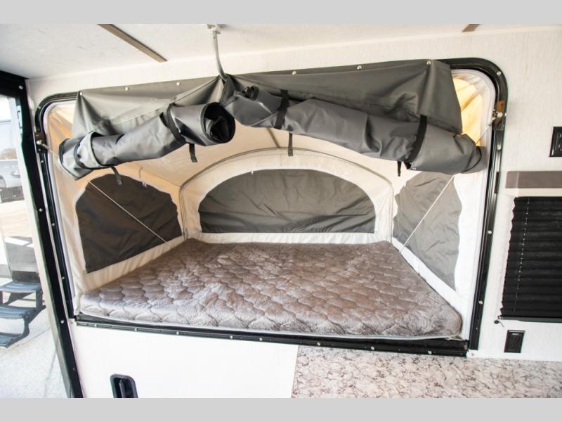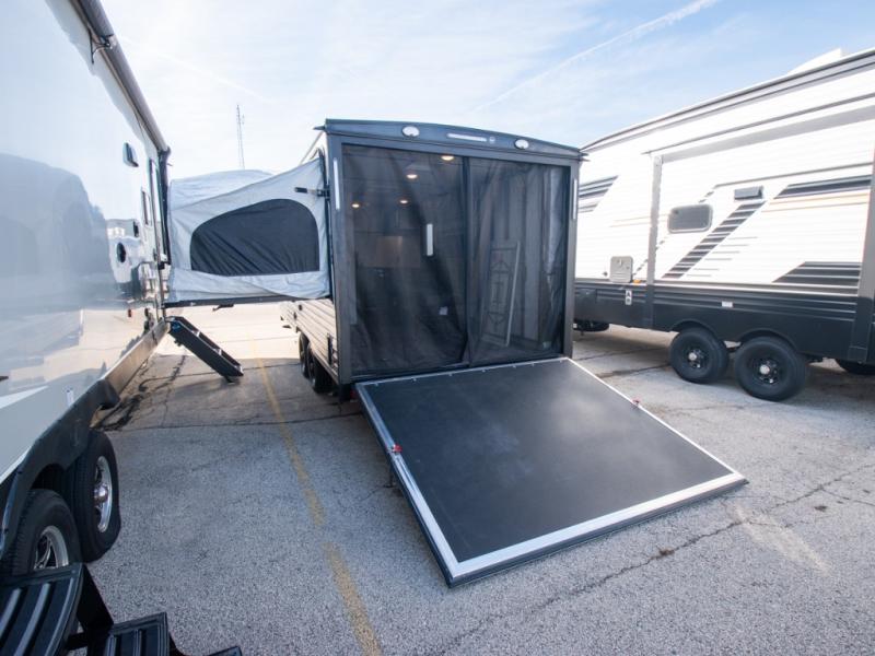 Get ready for a great camping experience where you can take along your favorite ride-on toys, kayaks, or other items that you may not normally have room to load as this toy hauler features 13' 2" of cargo space that can easily be loaded using the rear ramp door. Once unloaded, set up with the fold-down bed that will make for a great night's rest. There is also a jiffy sofa that can transform into added sleeping space at night. The kitchen amenities will make it easy to create a warm meal, and you can get cleaned up and refreshed in the bathroom with tub/shower and toilet. And when the optional tent bed is added on this model, you can sleep more campers!