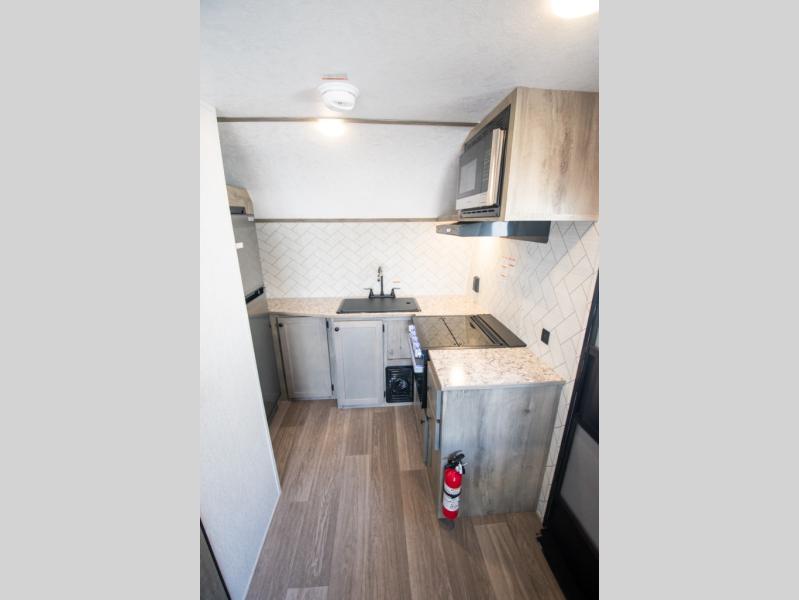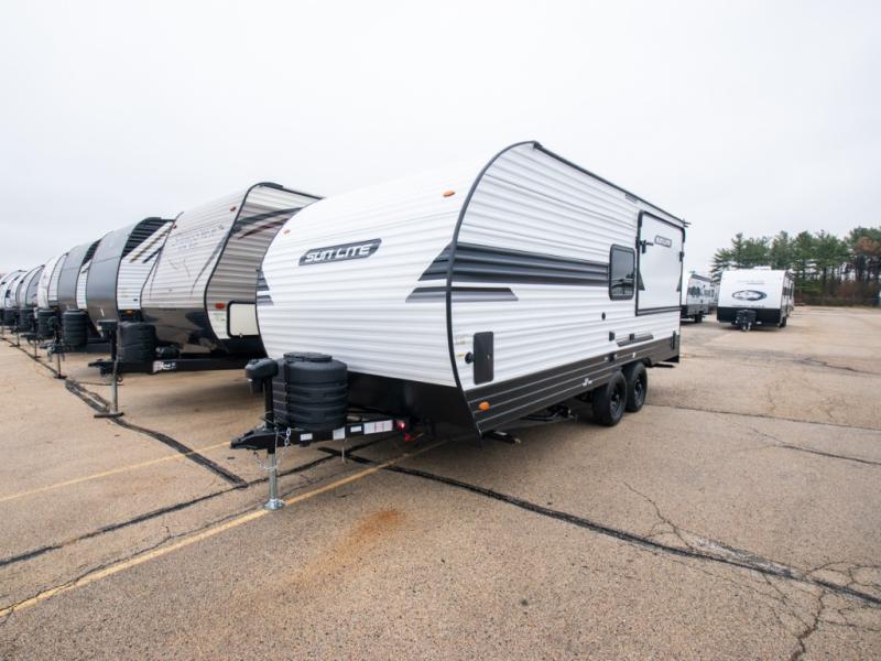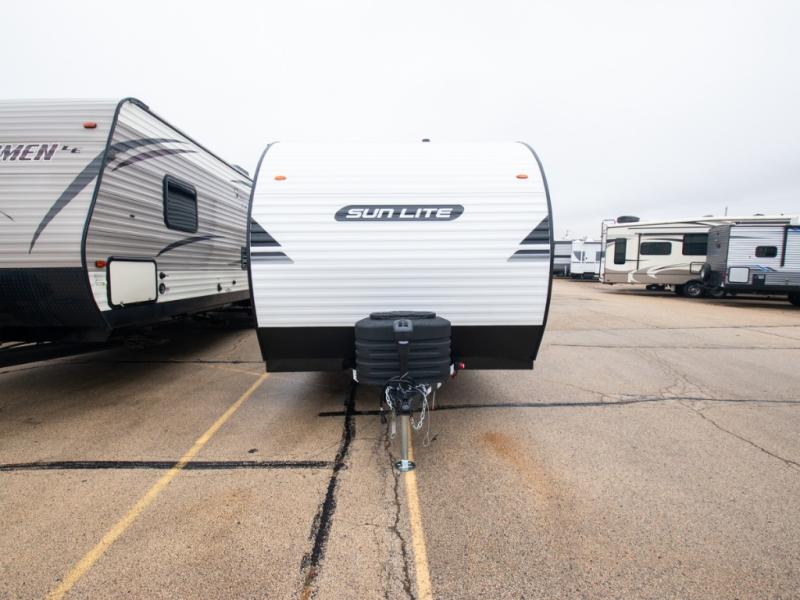 You can trust the build and enjoy your experience with any one of these Sunset Park RV Sun Lite travel trailers or toy haulers! Their aerodynamic profile is not only easy to haul, but also saves on fuel. They are built to withstand years of traveling even though they are lightweight with a diamond plate rock guard, a one piece PVC roof membrane, Dexter Spring-Leaf axles, and tinted safety glass windows. Some comfort standards you are sure to enjoy are the two-burner stove top range with hood, light and fan, plus the refrigerator and microwave, and an outside shower to help keep the dirt outdoors where it belongs.