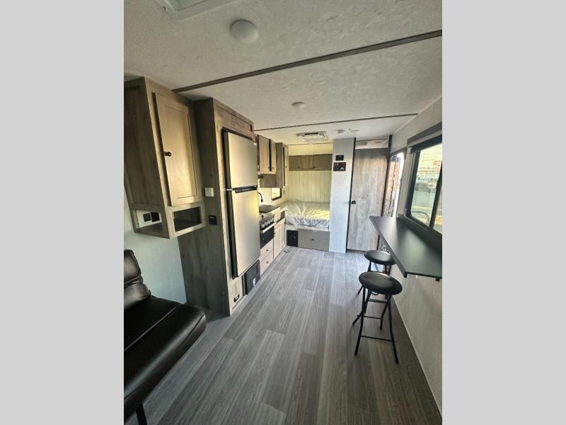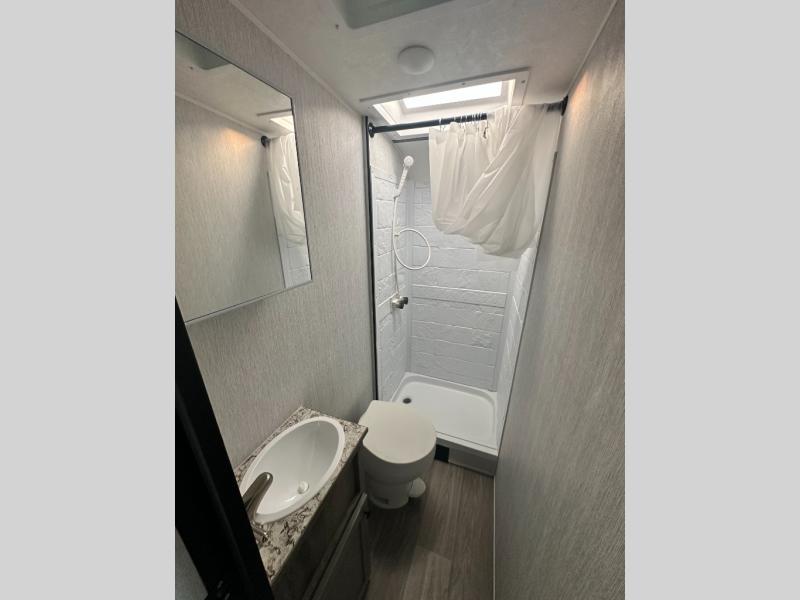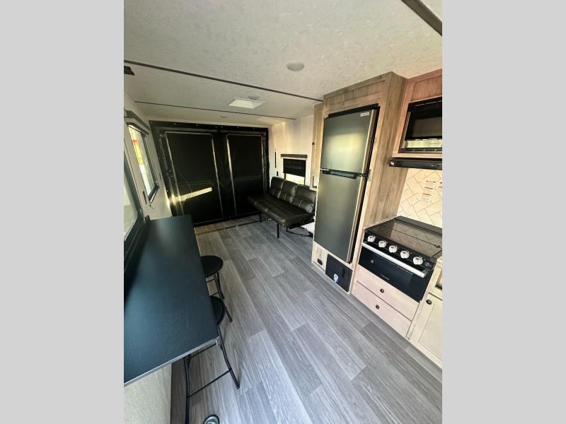 With premium features and a practical design, this toy hauler is the ultimate companion for your next escapade! The 66" sofa invites you to relax and unwind, while the adjacent area is perfect for setting up your gear or enjoying a meal. The refrigerator keeps your snacks and drinks fresh, and the three-burner stove is ready to whip up a hearty meal. Also, the sink and ample counter space make meal prep a breeze, while the nearby storage keeps everything you need within easy reach. The full bathroom is a welcome retreat, featuring a spacious 24 x 32 shower that's perfect for rinsing off after a long day of adventure, and the 60 x 74 bed is a cozy haven, perfect for recharging after a day of exploring. Plus, the generous cargo area is ideal for hauling your toys, gear, and equipment, so you can bring everything you need for the ultimate adventure.