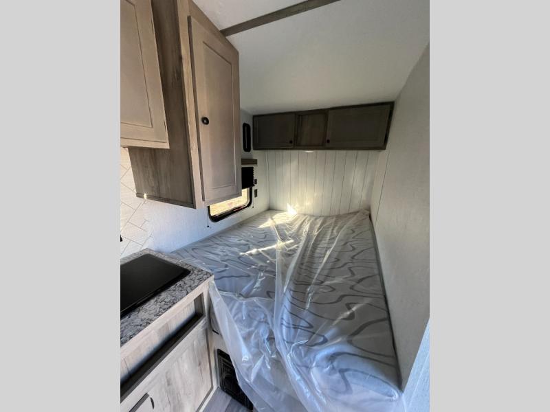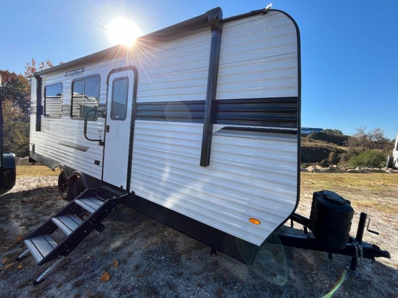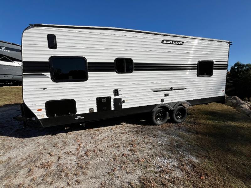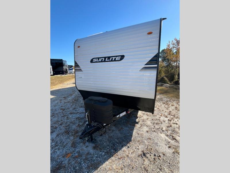You can trust the build and enjoy your experience with any one of these Sunset Park RV Sun Lite travel trailers! Their aerodynamic profile is not only easy to haul, but also saves on fuel. They are built to withstand years of traveling even though they are lightweight with a diamond plate rock guard, a one piece PVC roof membrane, Dexter Spring-Leaf axles, and tinted safety glass windows. Some comfort standards you are sure to enjoy are the two-burner stove top range with hood, light and fan, plus the refrigerator and microwave, and an outside shower to help keep the dirt outdoors where it belongs.