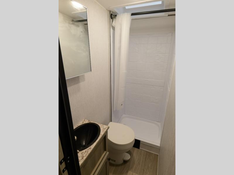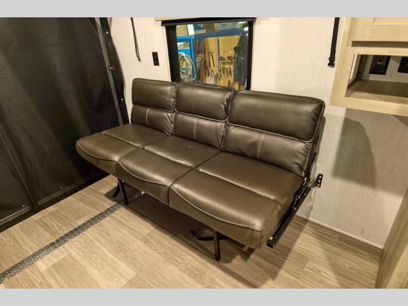 With premium features and a practical design, this toy hauler is the ultimate companion for your next escapade! The 66" sofa invites you to relax and unwind, while the adjacent area is perfect for setting up your gear or enjoying a meal. The refrigerator keeps your snacks and drinks fresh, and the three-burner stove is ready to whip up a hearty meal. Also, the sink and ample counter space make meal prep a breeze, while the nearby storage keeps everything you need within easy reach. The full bathroom is a welcome retreat, featuring a spacious 24 x 32 shower that's perfect for rinsing off after a long day of adventure, and the 60 x 74 bed is a cozy haven, perfect for recharging after a day of exploring. Plus, the generous cargo area is ideal for hauling your toys, gear, and equipment, so you can bring everything you need for the ultimate adventure.