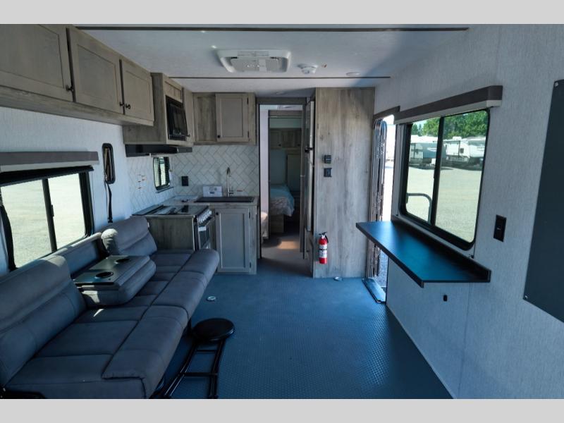 Load up your riding gear and head for the trails in this toy hauler. Once you've unloaded your toys from the ramp door, you can put out the power awning, then head inside to make lunch on the three burner cooktop or in the microwave oven. There is a bartop with stools where you can dine together, plus a sofa to relax. Your guests can sleep on the bed in the garage, while you take the bed in the front bedroom.