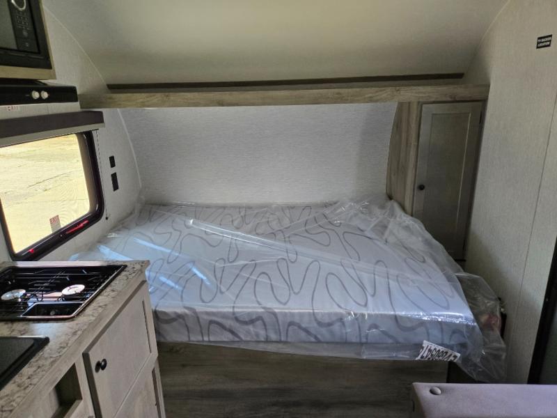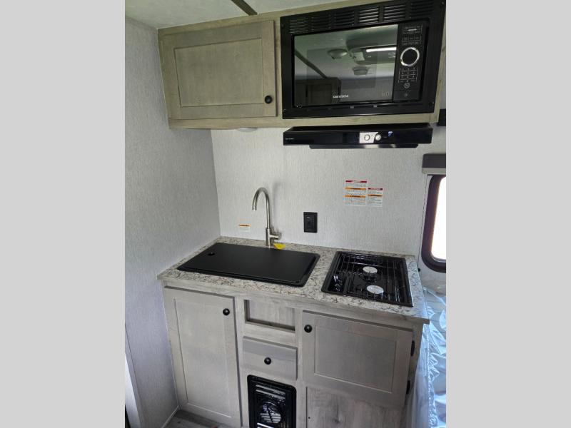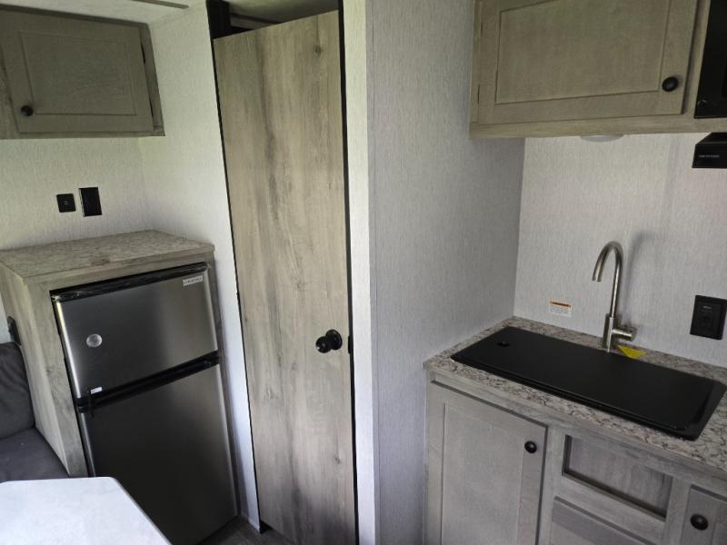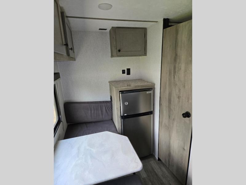 This lightweight travel trailer is perfect for two to three campers each night! You will sleep soundly on the front 54" x 74" bed with an overhead shelf and a closet for your things. Whip up eggs and bacon on the two burner cooktop in the morning, then dine at the 30" booth dinette. This can also double as sleeping space for an overnight guest or two little ones! The private bath with a 24" x 32" shower and a toilet will let you freshen up each day, and the double sink in the kitchen provides a place to wash your hands and teeth at night. You will also appreciate having a 4.3 cu. ft. 12V refrigerator to keep your food fresh and a 5K BTU wall A/C to keep you comfortable all summer long!