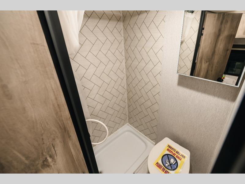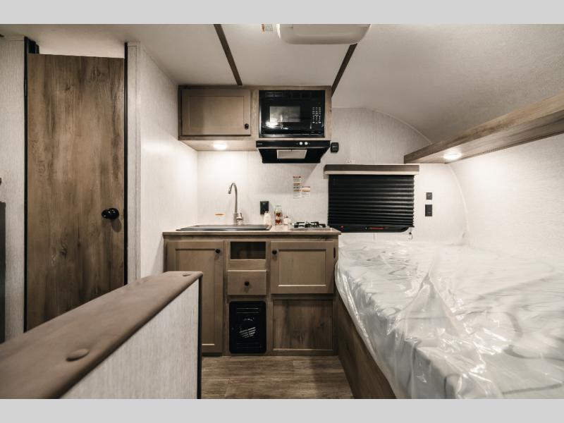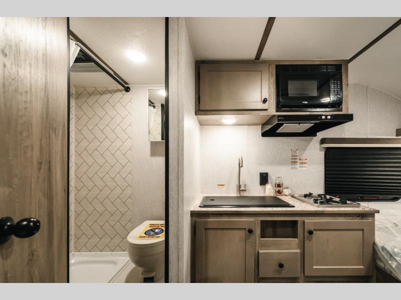 This lightweight travel trailer is perfect for two to three campers each night! You will sleep soundly on the front 54" x 74" bed with an overhead shelf and a closet for your things. Whip up eggs and bacon on the two burner cooktop in the morning, then dine at the 30" booth dinette. This can also double as sleeping space for an overnight guest or two little ones! The private bath with a 24" x 32" shower and a toilet will let you freshen up each day, and the double sink in the kitchen provides a place to wash your hands and teeth at night. You will also appreciate having a 4.3 cu. ft. 12V refrigerator to keep your food fresh and a 5K BTU wall A/C to keep you comfortable all summer long!