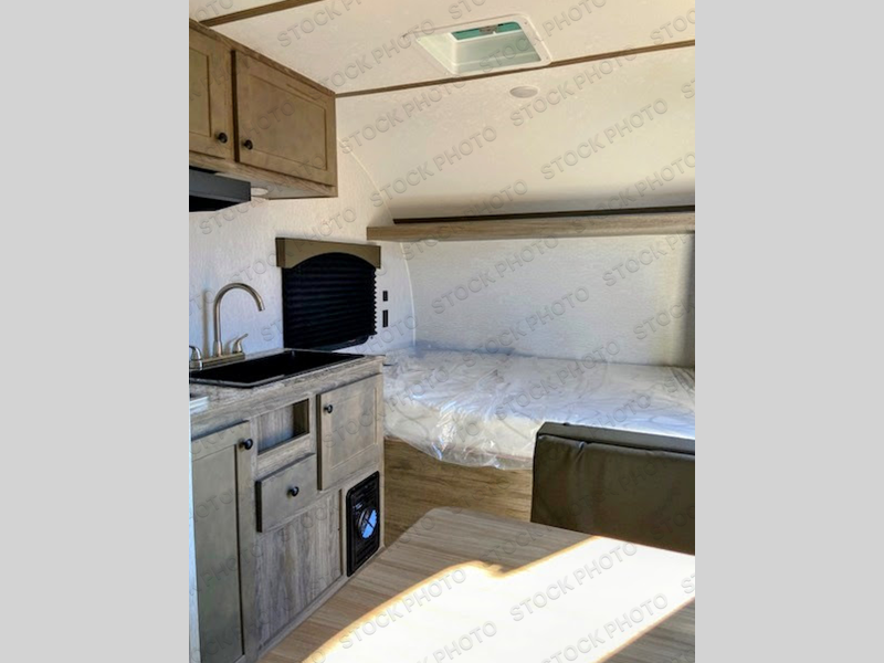 This lightweight travel trailer is perfect for two to three campers each night! You will sleep soundly on the front 54" x 74" bed with an overhead shelf and a closet for your things. Whip up eggs and bacon on the two burner cooktop in the morning, then dine at the 30" booth dinette. This can also double as sleeping space for an overnight guest or two little ones! The private bath with a 24" x 32" shower and a toilet will let you freshen up each day, and the double sink in the kitchen provides a place to wash your hands and teeth at night. You will also appreciate having a 4.3 cu. ft. 12V refrigerator to keep your food fresh and a 5K BTU wall A/C to keep you comfortable all summer long!