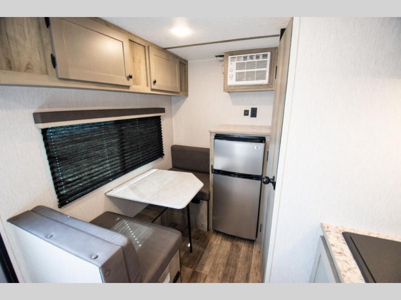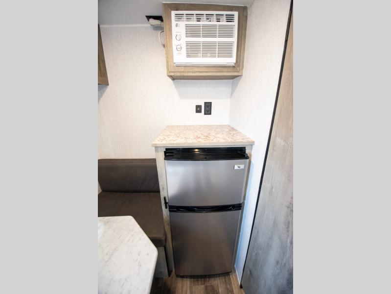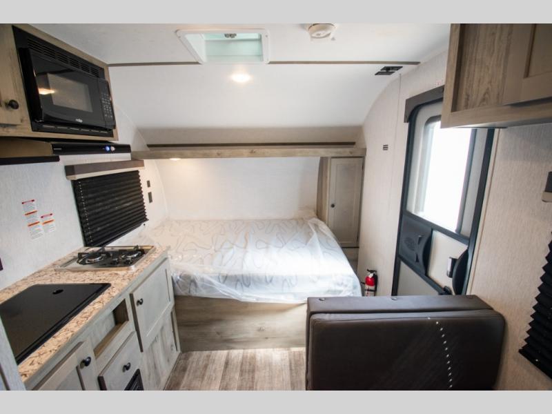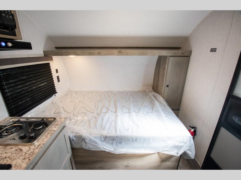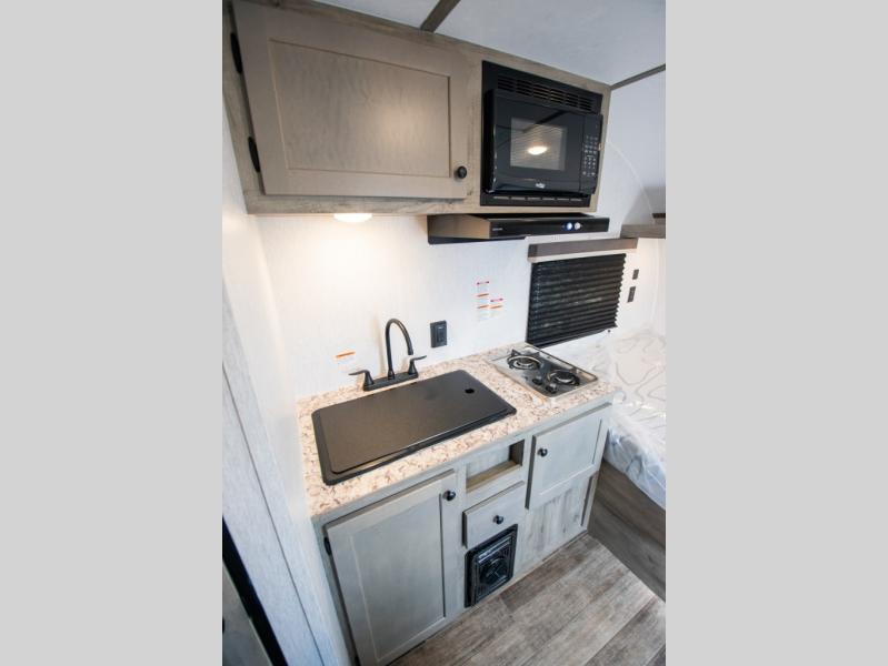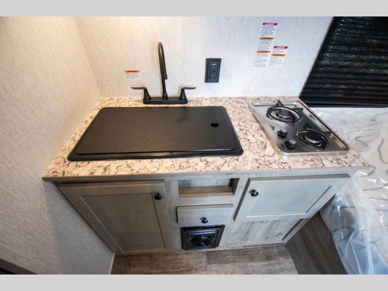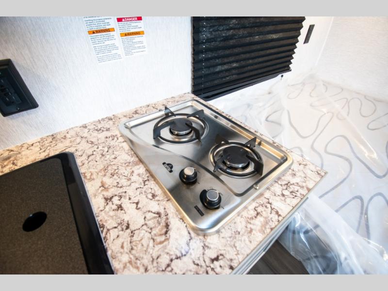This lightweight travel trailer is perfect for two to three campers each night! You will sleep soundly on the front 54" x 74" bed with an overhead shelf and a closet for your things. Whip up eggs and bacon on the two burner cooktop in the morning, then dine at the 30" booth dinette. This can also double as sleeping space for an overnight guest or two little ones! The private bath with a 24" x 32" shower and a toilet will let you freshen up each day, and the double sink in the kitchen provides a place to wash your hands and teeth at night. You will also appreciate having a 4.3 cu. ft. 12V refrigerator to keep your food fresh and a 5K BTU wall A/C to keep you comfortable all summer long!