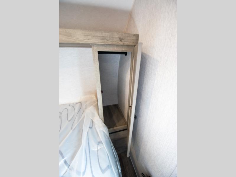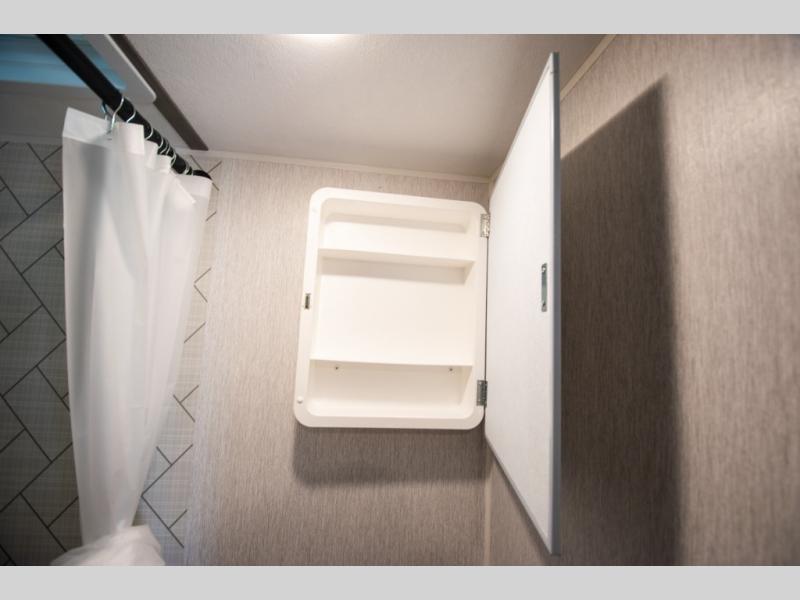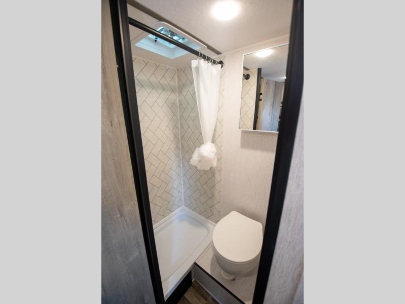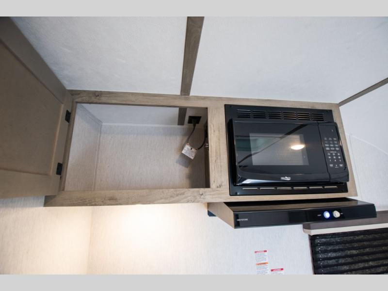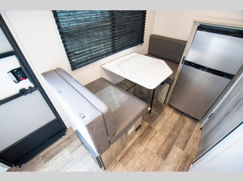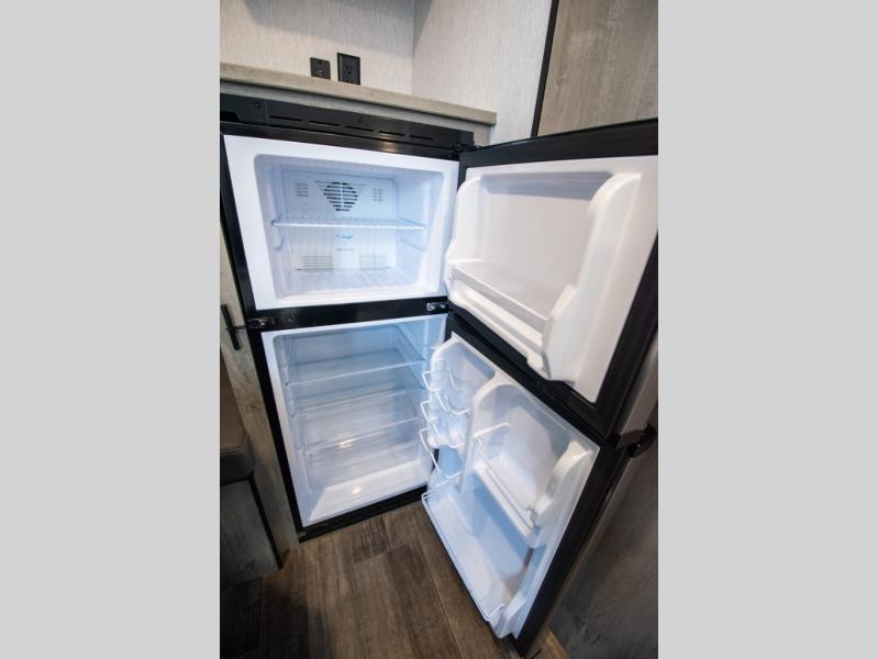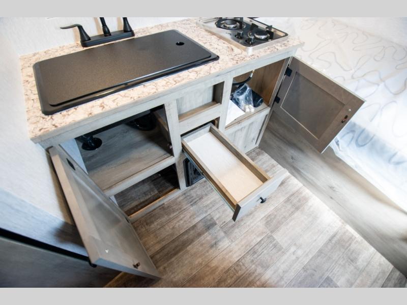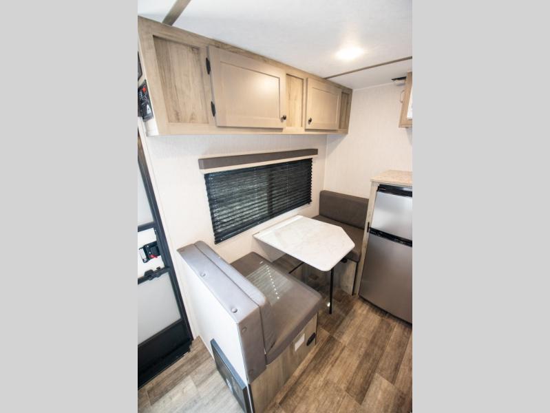 This lightweight travel trailer is perfect for two to three campers each night! You will sleep soundly on the front 54" x 74" bed with an overhead shelf and a closet for your things. Whip up eggs and bacon on the two burner cooktop in the morning, then dine at the 30" booth dinette. This can also double as sleeping space for an overnight guest or two little ones! The private bath with a 24" x 32" shower and a toilet will let you freshen up each day, and the double sink in the kitchen provides a place to wash your hands and teeth at night. You will also appreciate having a 4.3 cu. ft. 12V refrigerator to keep your food fresh and a 5K BTU wall A/C to keep you comfortable all summer long!