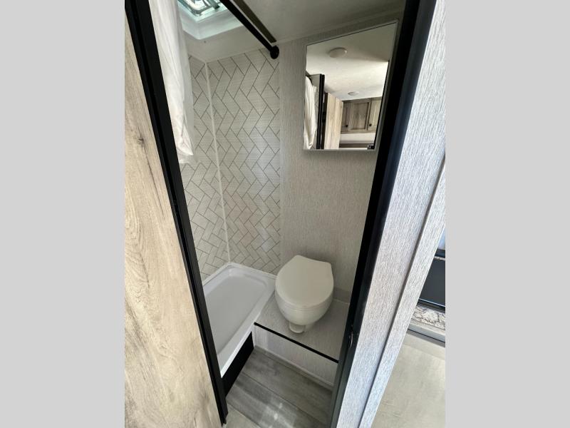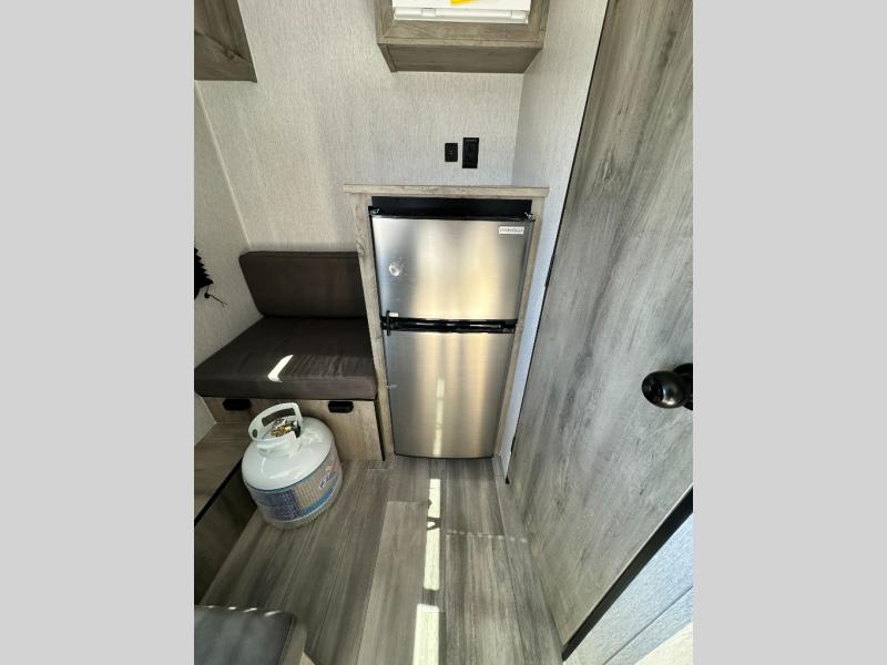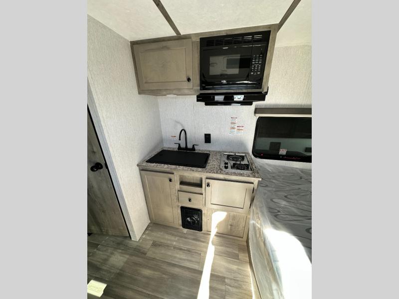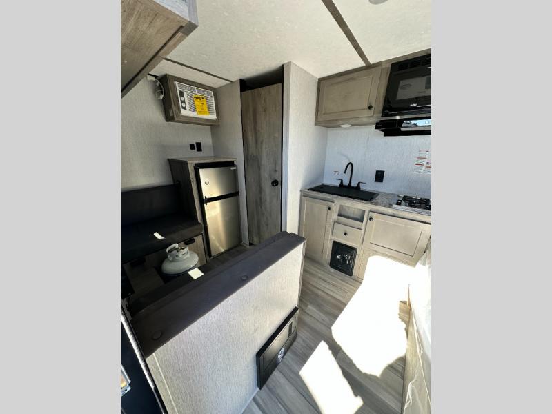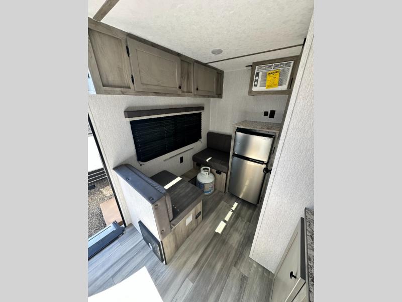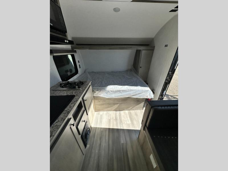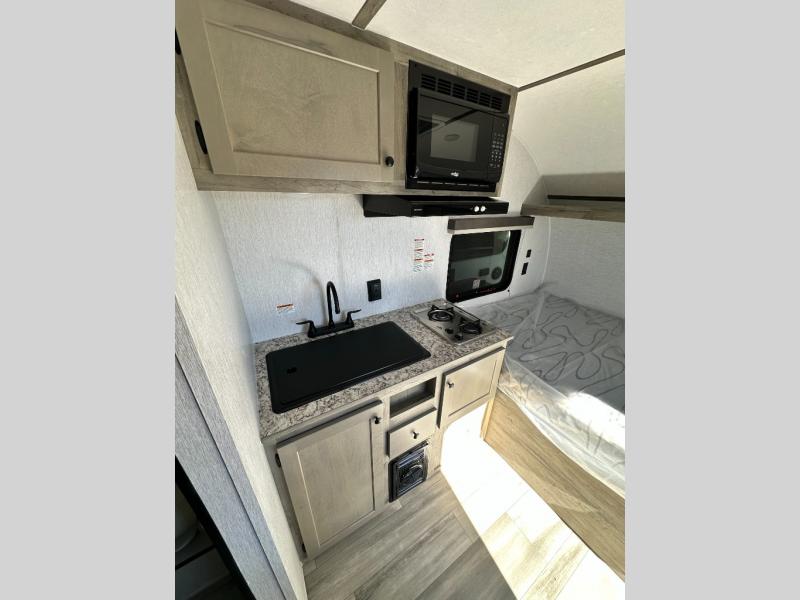 This lightweight travel trailer is perfect for two to three campers each night! You will sleep soundly on the front 54" x 74" bed with an overhead shelf and a closet for your things. Whip up eggs and bacon on the two burner cooktop in the morning, then dine at the 30" booth dinette. This can also double as sleeping space for an overnight guest or two little ones! The private bath with a 24" x 32" shower and a toilet will let you freshen up each day, and the double sink in the kitchen provides a place to wash your hands and teeth at night. You will also appreciate having a 4.3 cu. ft. 12V refrigerator to keep your food fresh and a 5K BTU wall A/C to keep you comfortable all summer long!