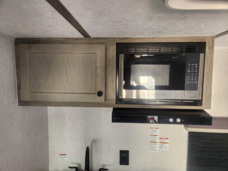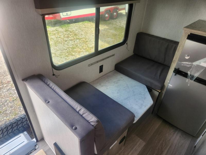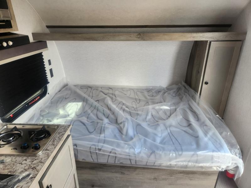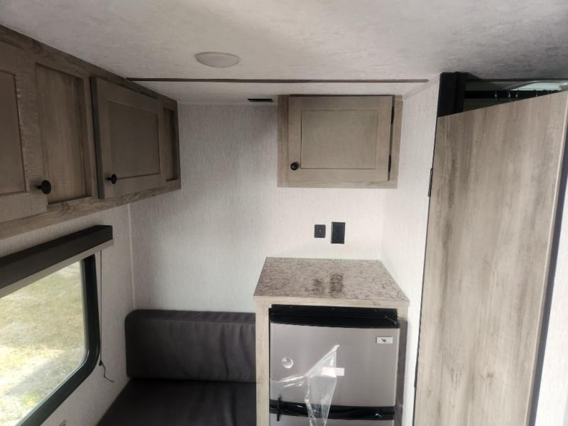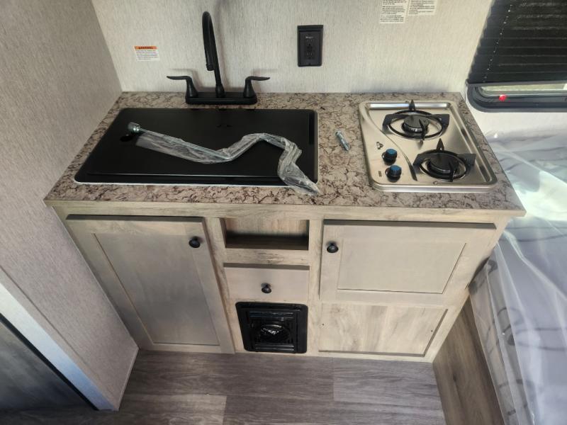This lightweight travel trailer is perfect for two to three campers each night! You will sleep soundly on the front 54" x 74" bed with an overhead shelf and a closet for your things. Whip up eggs and bacon on the two burner cooktop in the morning, then dine at the 30" booth dinette. This can also double as sleeping space for an overnight guest or two little ones! The private bath with a 24" x 32" shower and a toilet will let you freshen up each day, and the double sink in the kitchen provides a place to wash your hands and teeth at night. You will also appreciate having a 4.3 cu. ft. 12V refrigerator to keep your food fresh and a 5K BTU wall A/C to keep you comfortable all summer long!