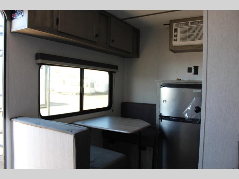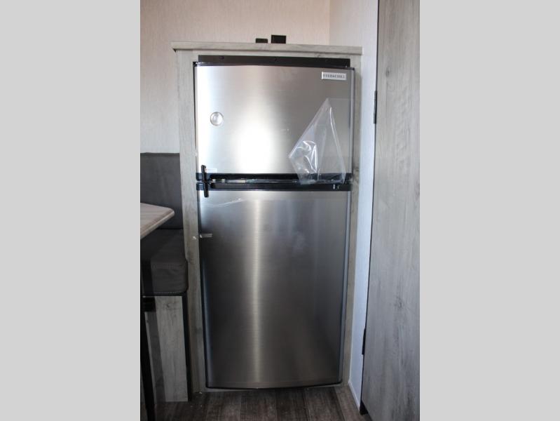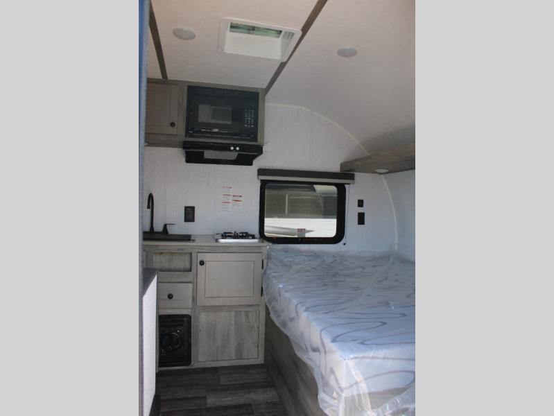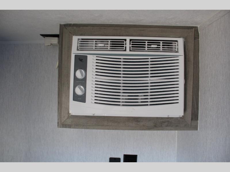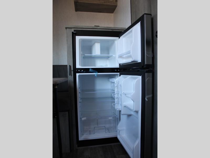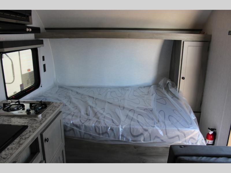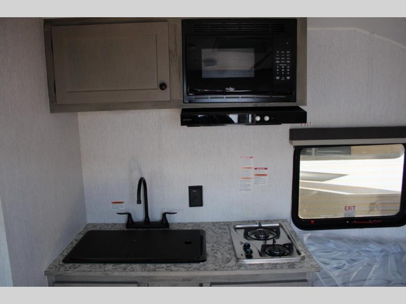 This lightweight travel trailer is perfect for two to three campers each night! You will sleep soundly on the front 54" x 74" bed with an overhead shelf and a closet for your things. Whip up eggs and bacon on the two burner cooktop in the morning, then dine at the 30" booth dinette. This can also double as sleeping space for an overnight guest or two little ones! The private bath with a 24" x 32" shower and a toilet will let you freshen up each day, and the double sink in the kitchen provides a place to wash your hands and teeth at night. You will also appreciate having a 4.3 cu. ft. 12V refrigerator to keep your food fresh and a 5K BTU wall A/C to keep you comfortable all summer long!