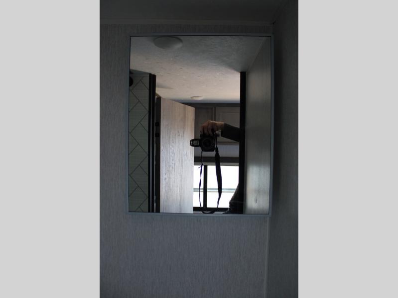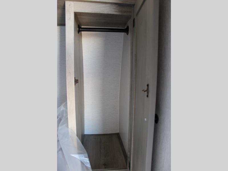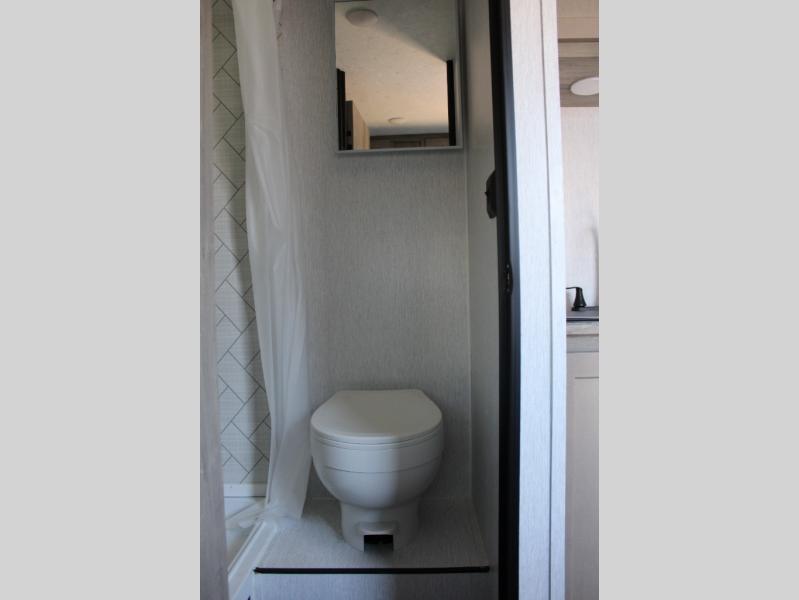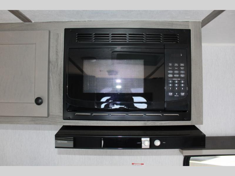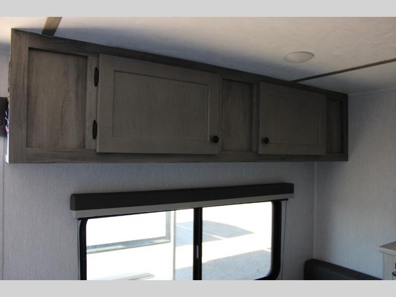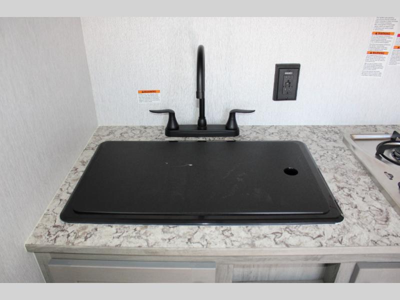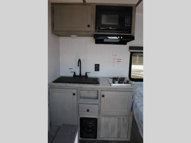 This lightweight travel trailer is perfect for two to three campers each night! You will sleep soundly on the front 54" x 74" bed with an overhead shelf and a closet for your things. Whip up eggs and bacon on the two burner cooktop in the morning, then dine at the 30" booth dinette. This can also double as sleeping space for an overnight guest or two little ones! The private bath with a 24" x 32" shower and a toilet will let you freshen up each day, and the double sink in the kitchen provides a place to wash your hands and teeth at night. You will also appreciate having a 4.3 cu. ft. 12V refrigerator to keep your food fresh and a 5K BTU wall A/C to keep you comfortable all summer long!