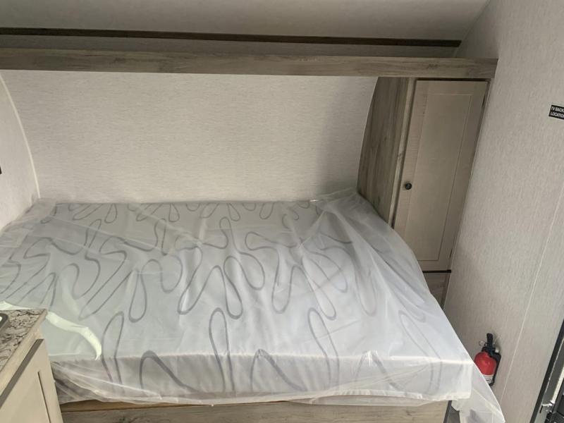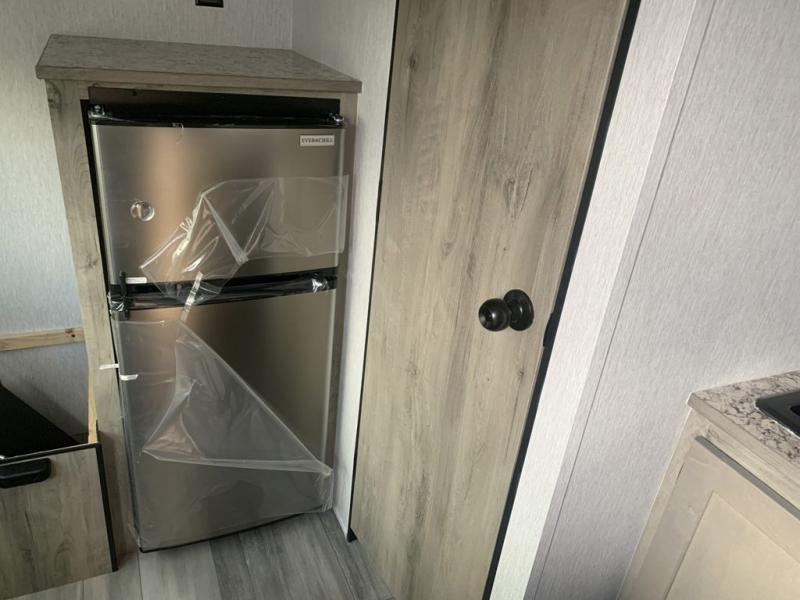 This lightweight travel trailer is perfect for two to three campers each night! You will sleep soundly on the front 54" x 74" bed with an overhead shelf and a closet for your things. Whip up eggs and bacon on the two burner cooktop in the morning, then dine at the 30" booth dinette. This can also double as sleeping space for an overnight guest or two little ones! The private bath with a 24" x 32" shower and a toilet will let you freshen up each day, and the double sink in the kitchen provides a place to wash your hands and teeth at night. You will also appreciate having a 4.3 cu. ft. 12V refrigerator to keep your food fresh and a 5K BTU wall A/C to keep you comfortable all summer long!