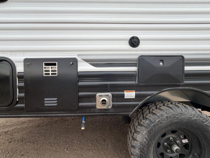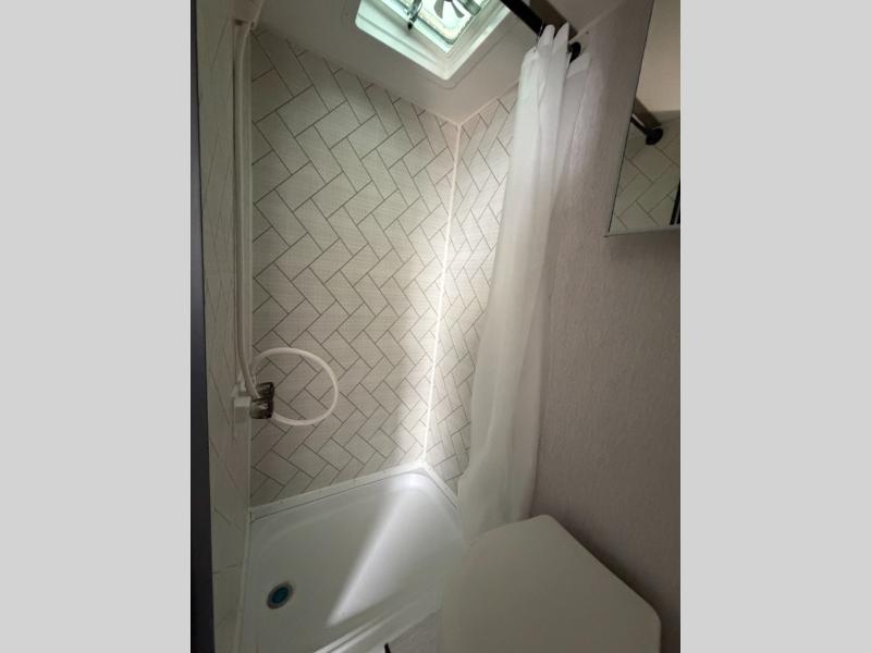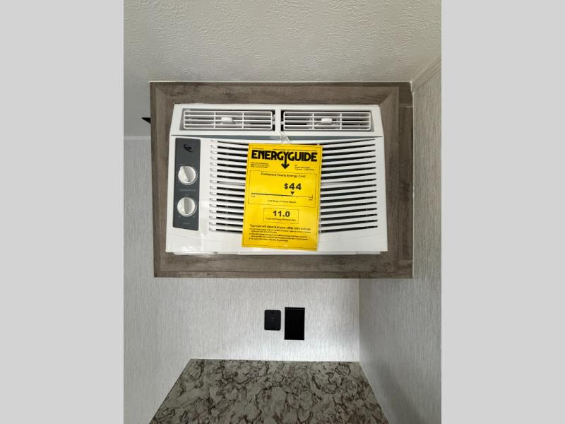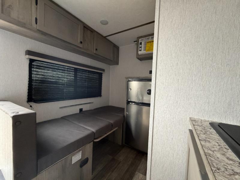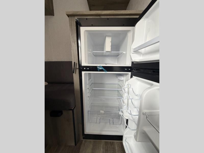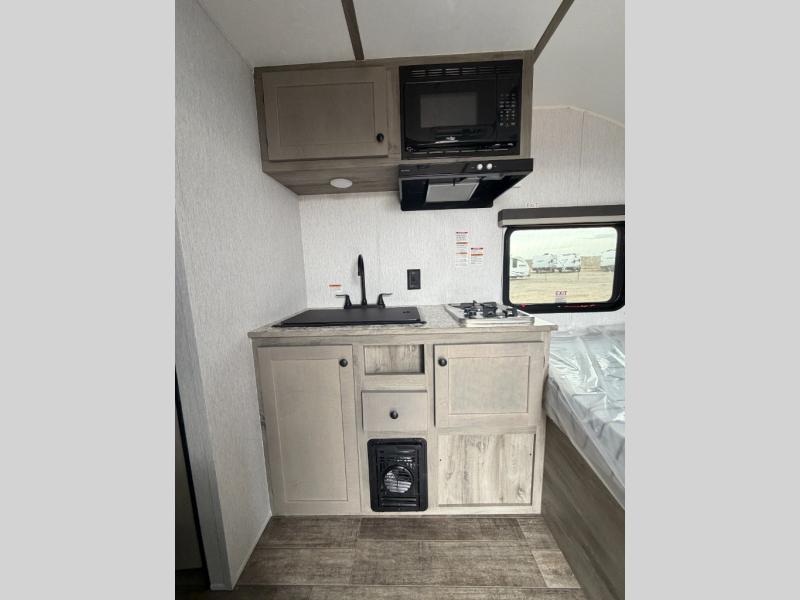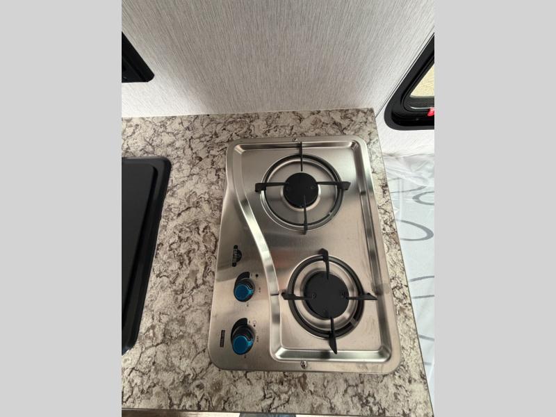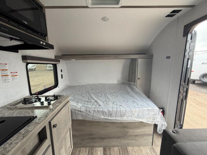 This lightweight travel trailer is perfect for two to three campers each night! You will sleep soundly on the front 54" x 74" bed with an overhead shelf and a closet for your things. Whip up eggs and bacon on the two burner cooktop in the morning, then dine at the 30" booth dinette. This can also double as sleeping space for an overnight guest or two little ones! The private bath with a 24" x 32" shower and a toilet will let you freshen up each day, and the double sink in the kitchen provides a place to wash your hands and teeth at night. You will also appreciate having a 4.3 cu. ft. 12V refrigerator to keep your food fresh and a 5K BTU wall A/C to keep you comfortable all summer long!