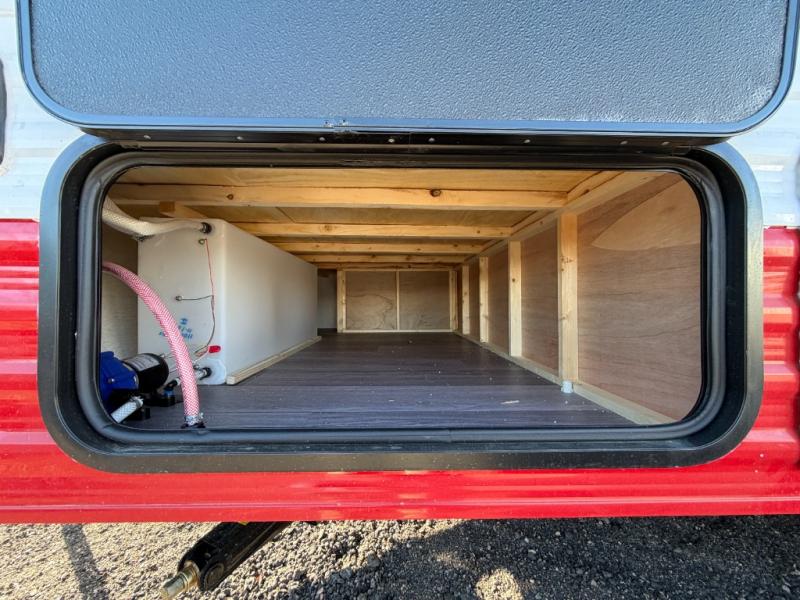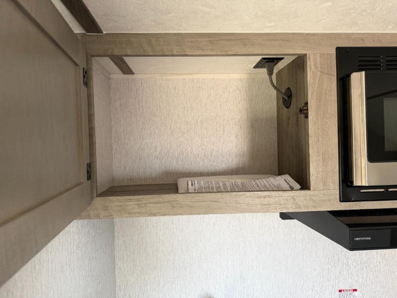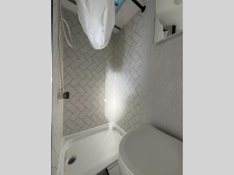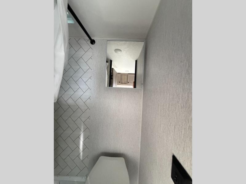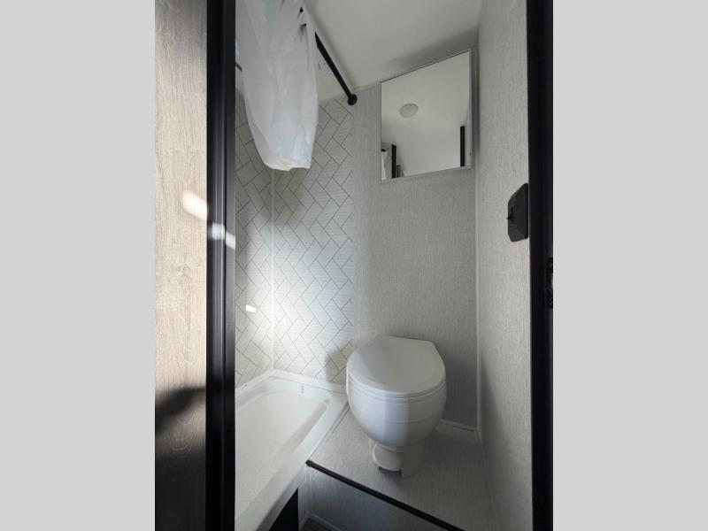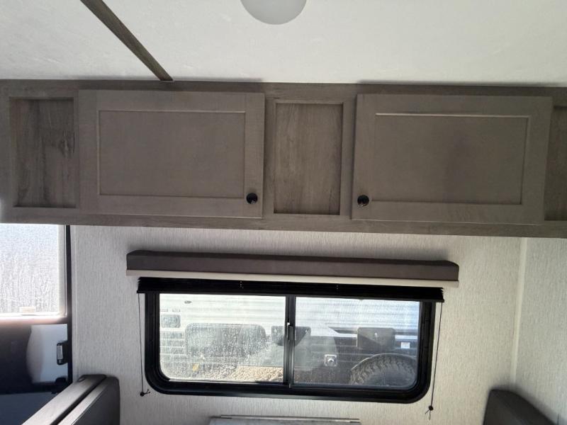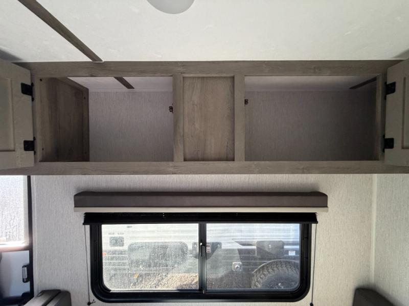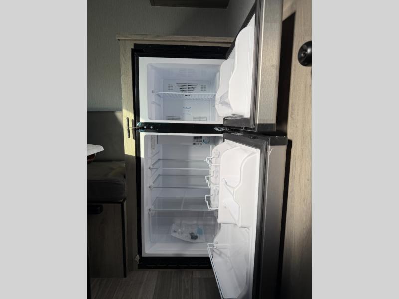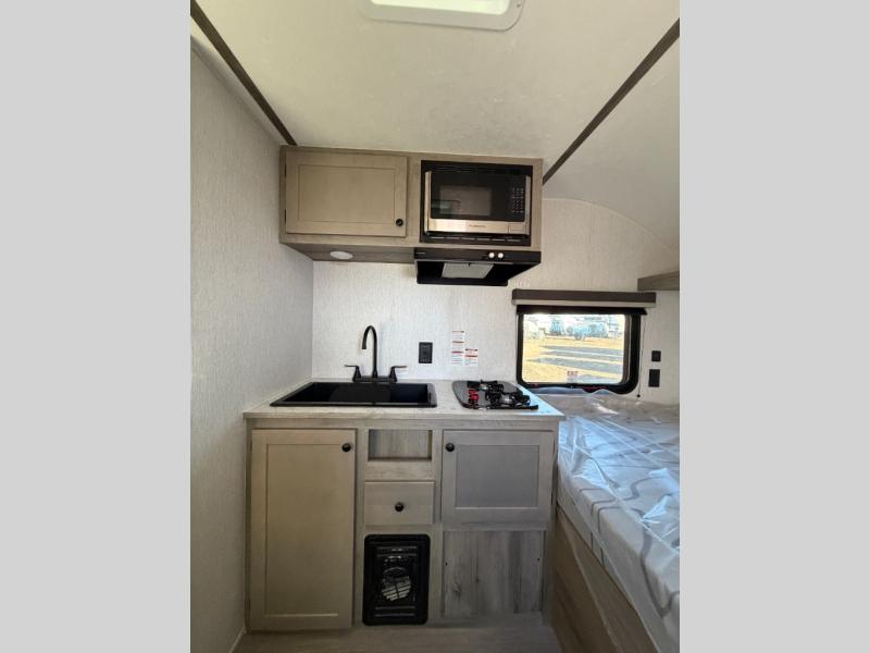 This lightweight travel trailer is perfect for two to three campers each night! You will sleep soundly on the front 54" x 74" bed with an overhead shelf and a closet for your things. Whip up eggs and bacon on the two burner cooktop in the morning, then dine at the 30" booth dinette. This can also double as sleeping space for an overnight guest or two little ones! The private bath with a 24" x 32" shower and a toilet will let you freshen up each day, and the double sink in the kitchen provides a place to wash your hands and teeth at night. You will also appreciate having a 4.3 cu. ft. 12V refrigerator to keep your food fresh and a 5K BTU wall A/C to keep you comfortable all summer long!