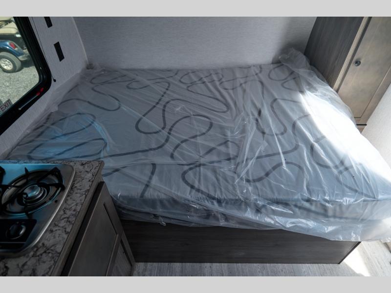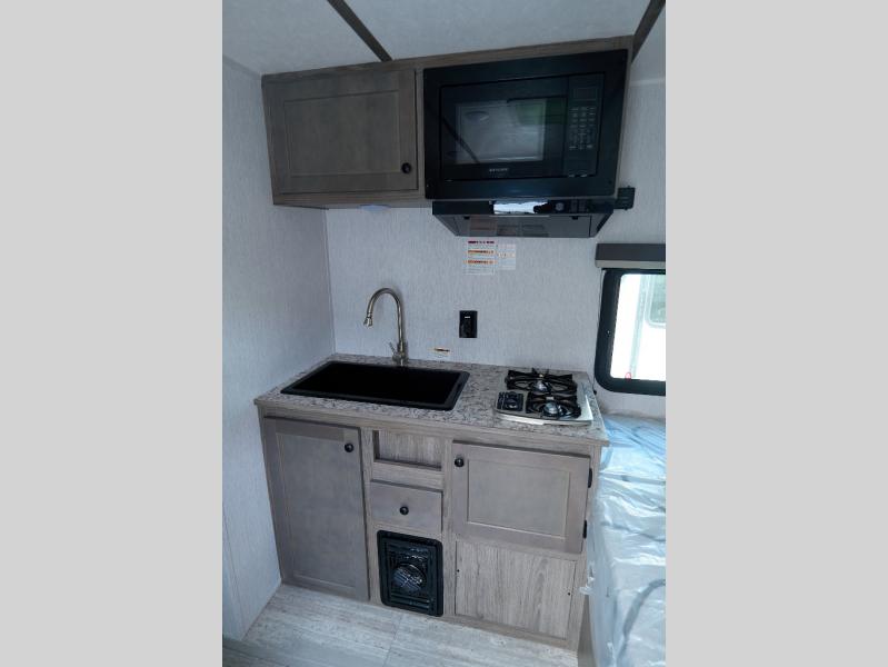 This lightweight travel trailer is perfect for a family of four! You will sleep soundly on the front 54" x 74" bed with an overhead shelf and a closet for your things, and there is a set of bunks along the curbside to the left of the entry door for two more. The top bunk is 24" x 68" with a bottom bunk that is 30" x 68. You can easily cook meals using the two burner cooktop and the double sink is great for cleaning up. The private bath with a 24" x 32" shower and a toilet will let you freshen up each day, and the double sink in the kitchen provides a place to wash your hands and brush your teeth at night. You will also appreciate having a 4.3 cu. ft. 12V refrigerator to keep your food fresh and a 5K BTU wall A/C to keep you comfortable all summer long!