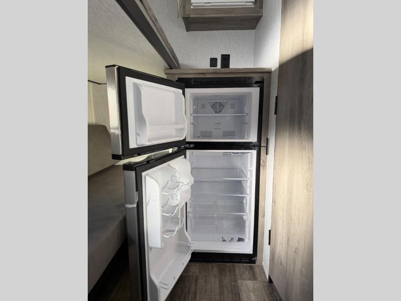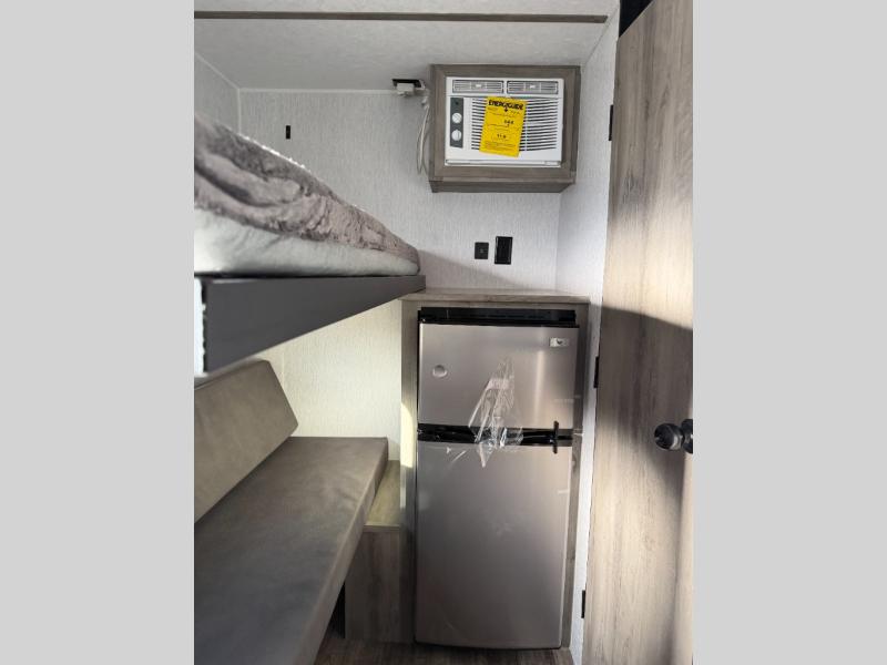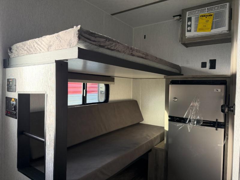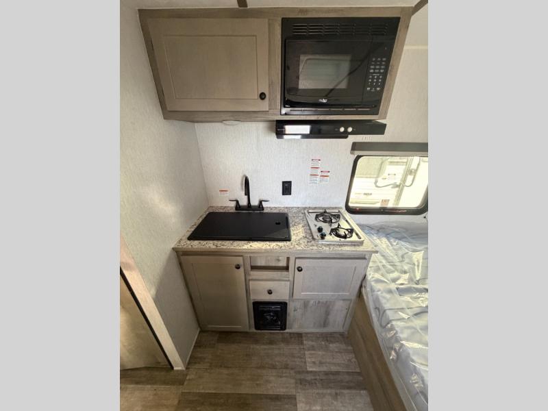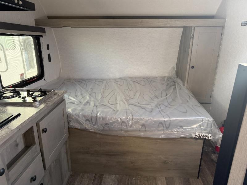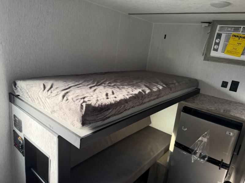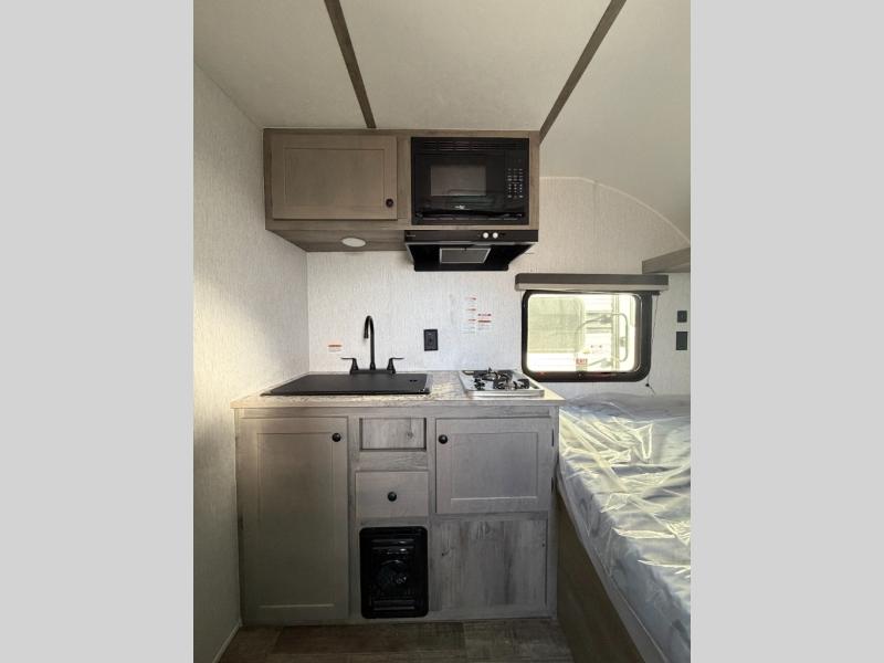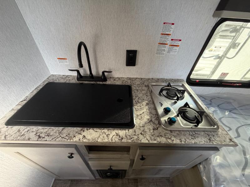 This lightweight travel trailer is perfect for a family of four! You will sleep soundly on the front 54" x 74" bed with an overhead shelf and a closet for your things, and there is a set of bunks along the curbside to the left of the entry door for two more. The top bunk is 24" x 68" with a bottom bunk that is 30" x 68. You can easily cook meals using the two burner cooktop and the double sink is great for cleaning up. The private bath with a 24" x 32" shower and a toilet will let you freshen up each day, and the double sink in the kitchen provides a place to wash your hands and brush your teeth at night. You will also appreciate having a 4.3 cu. ft. 12V refrigerator to keep your food fresh and a 5K BTU wall A/C to keep you comfortable all summer long!