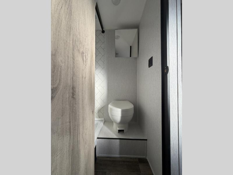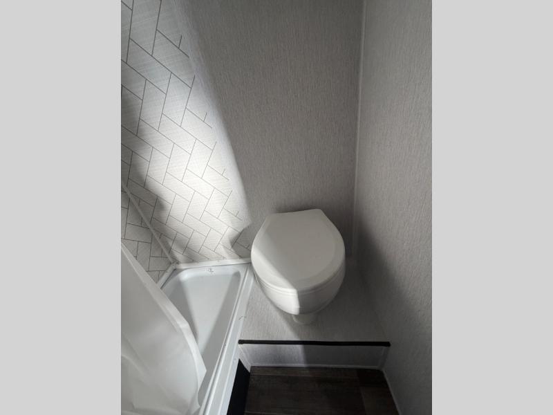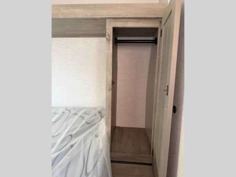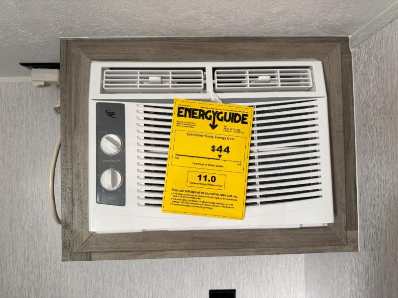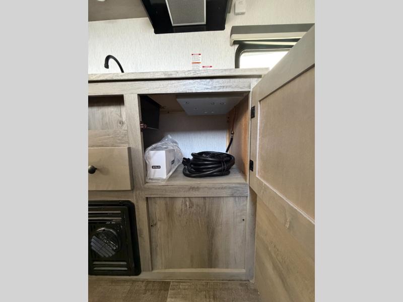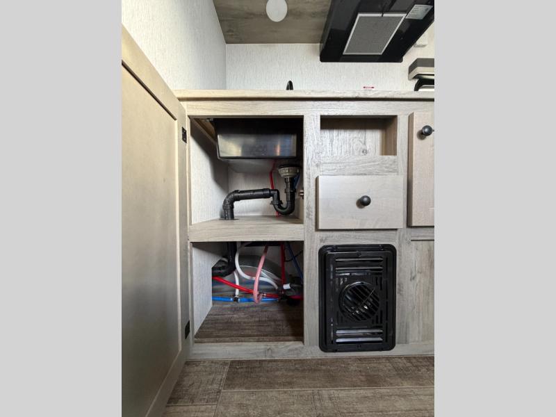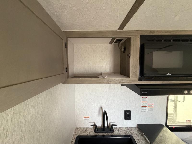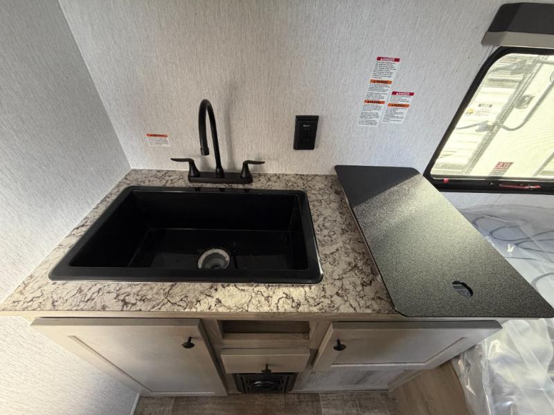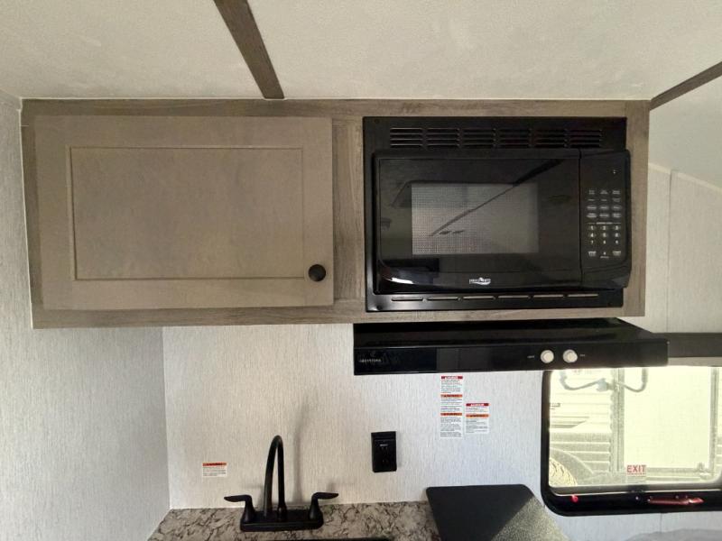 This lightweight travel trailer is perfect for a family of four! You will sleep soundly on the front 54" x 74" bed with an overhead shelf and a closet for your things, and there is a set of bunks along the curbside to the left of the entry door for two more. The top bunk is 24" x 68" with a bottom bunk that is 30" x 68. You can easily cook meals using the two burner cooktop and the double sink is great for cleaning up. The private bath with a 24" x 32" shower and a toilet will let you freshen up each day, and the double sink in the kitchen provides a place to wash your hands and brush your teeth at night. You will also appreciate having a 4.3 cu. ft. 12V refrigerator to keep your food fresh and a 5K BTU wall A/C to keep you comfortable all summer long!