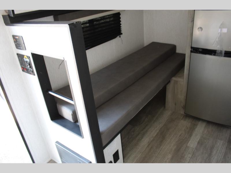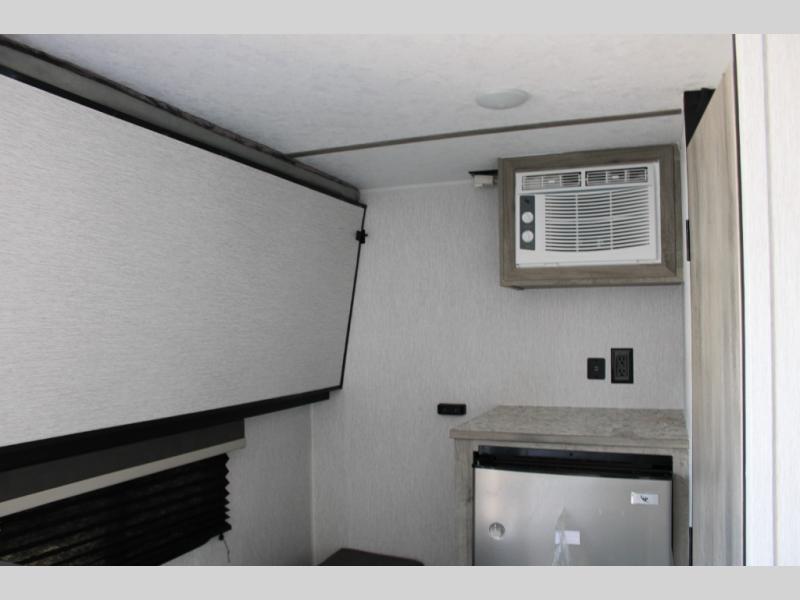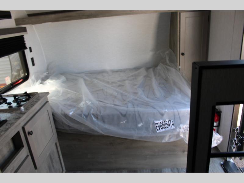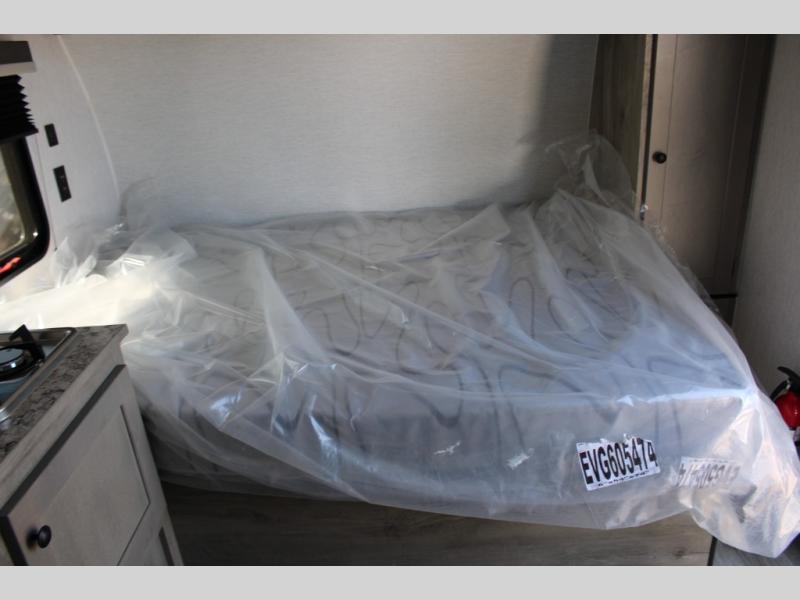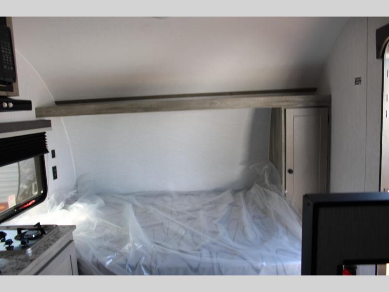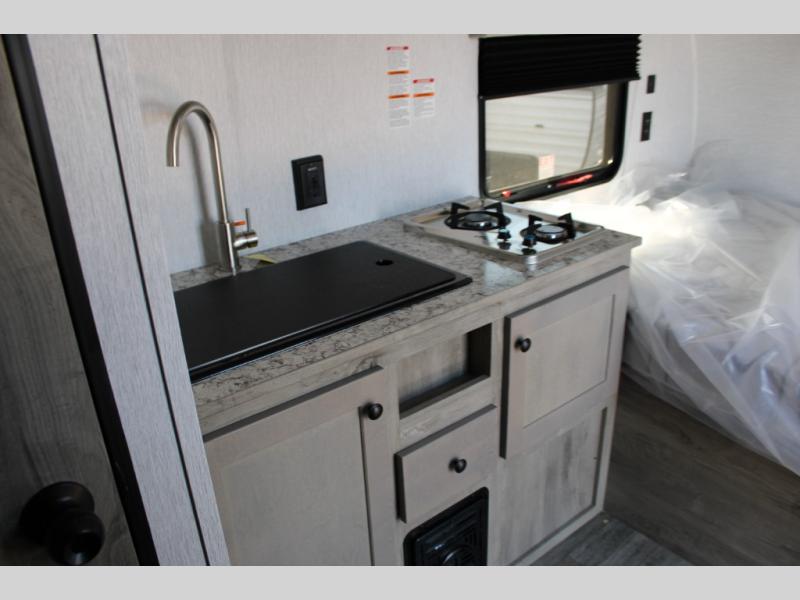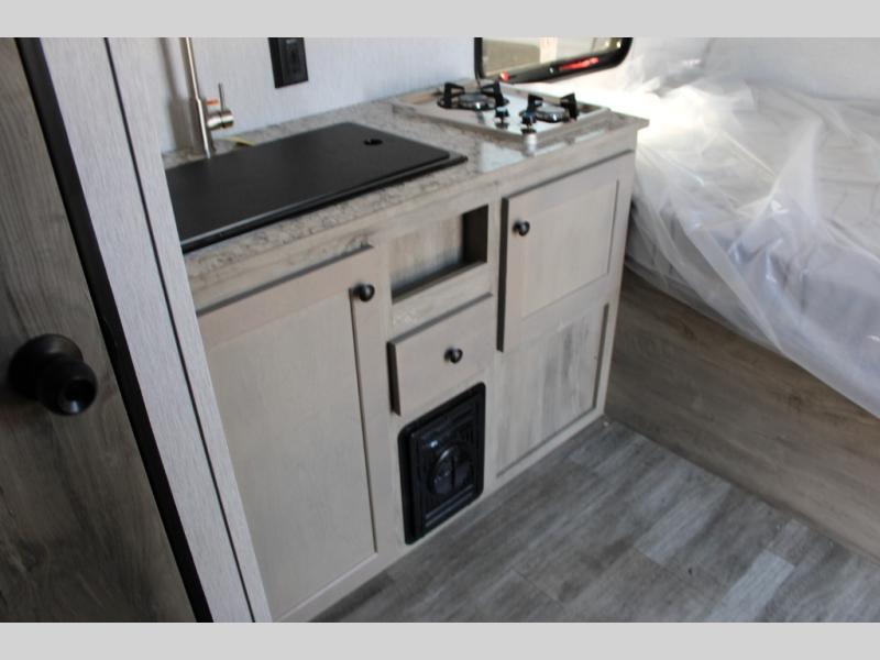 This lightweight travel trailer is perfect for a family of four! You will sleep soundly on the front 54" x 74" bed with an overhead shelf and a closet for your things, and there is a set of bunks along the curbside to the left of the entry door for two more. The top bunk is 24" x 68" with a bottom bunk that is 30" x 68. You can easily cook meals using the two burner cooktop and the double sink is great for cleaning up. The private bath with a 24" x 32" shower and a toilet will let you freshen up each day, and the double sink in the kitchen provides a place to wash your hands and brush your teeth at night. You will also appreciate having a 4.3 cu. ft. 12V refrigerator to keep your food fresh and a 5K BTU wall A/C to keep you comfortable all summer long!
