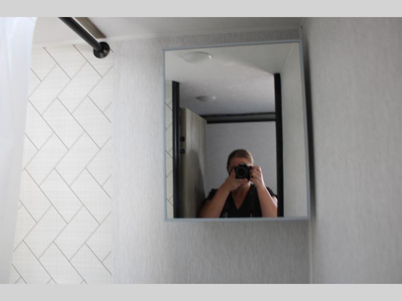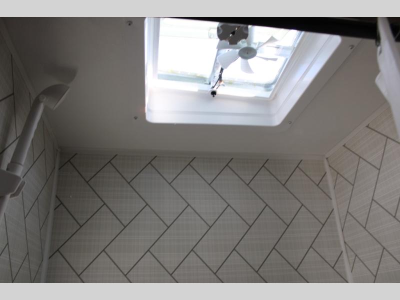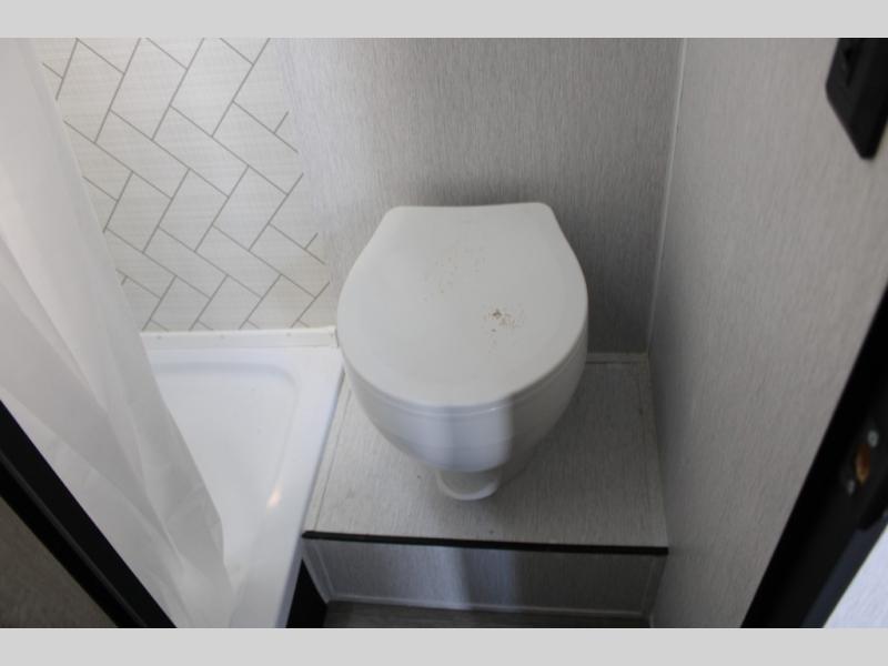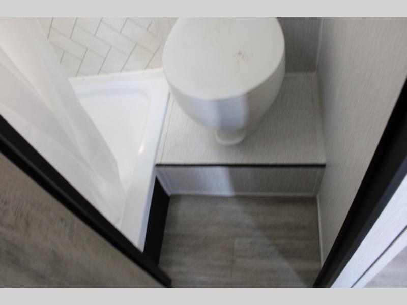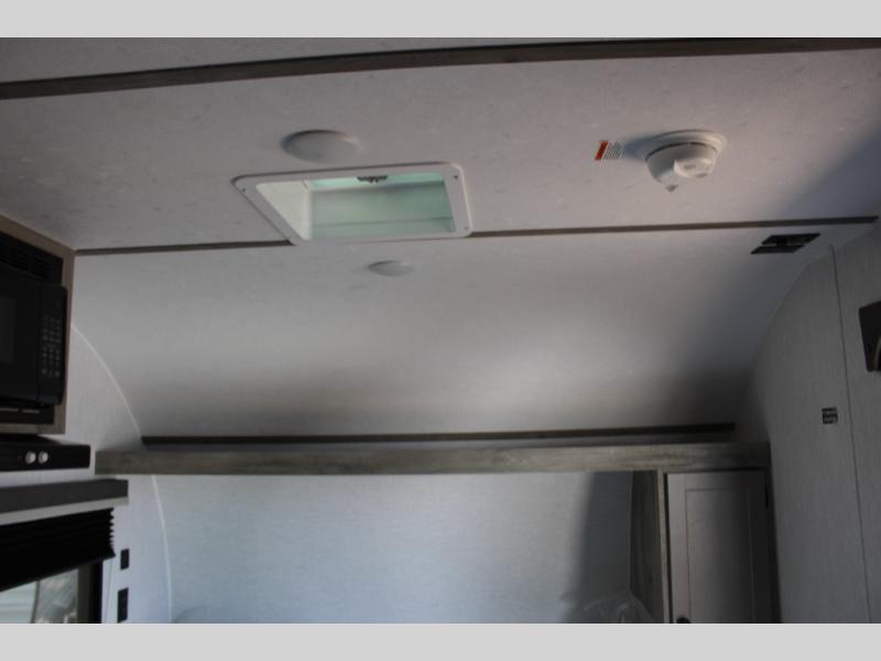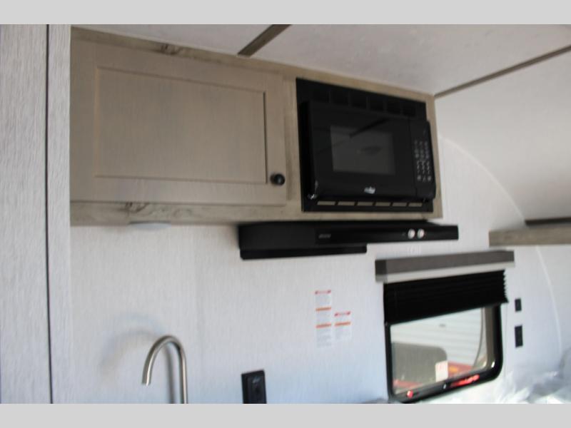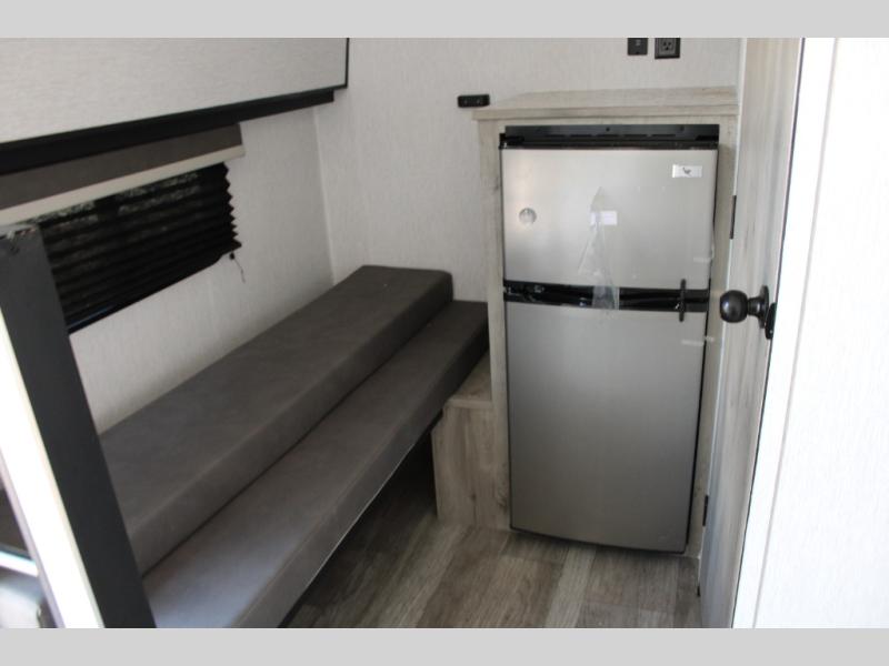 This lightweight travel trailer is perfect for a family of four! You will sleep soundly on the front 54" x 74" bed with an overhead shelf and a closet for your things, and there is a set of bunks along the curbside to the left of the entry door for two more. The top bunk is 24" x 68" with a bottom bunk that is 30" x 68. You can easily cook meals using the two burner cooktop and the double sink is great for cleaning up. The private bath with a 24" x 32" shower and a toilet will let you freshen up each day, and the double sink in the kitchen provides a place to wash your hands and brush your teeth at night. You will also appreciate having a 4.3 cu. ft. 12V refrigerator to keep your food fresh and a 5K BTU wall A/C to keep you comfortable all summer long!