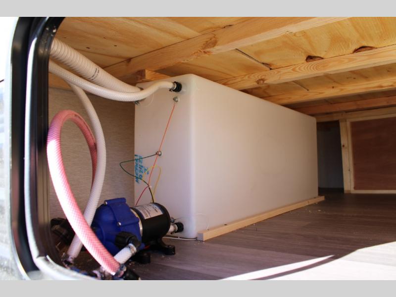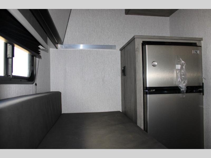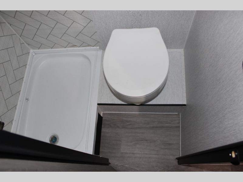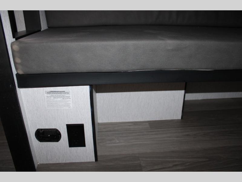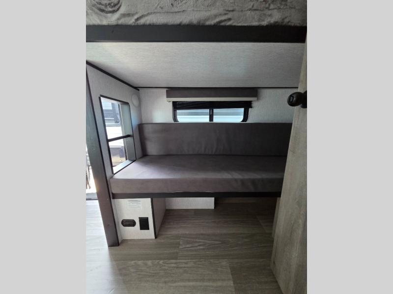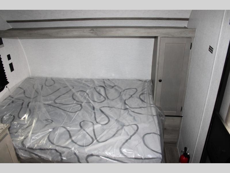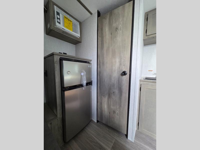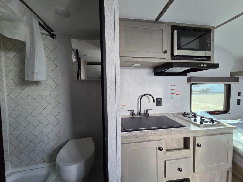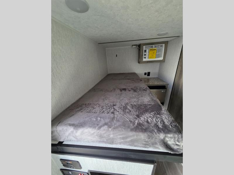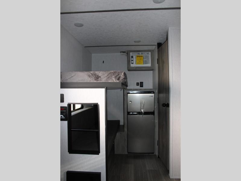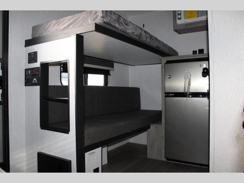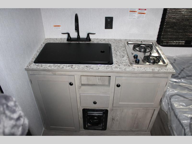 This lightweight travel trailer is perfect for a family of four! You will sleep soundly on the front 54" x 74" bed with an overhead shelf and a closet for your things, and there is a set of bunks along the curbside to the left of the entry door for two more. The top bunk is 24" x 68" with a bottom bunk that is 30" x 68. You can easily cook meals using the two burner cooktop and the double sink is great for cleaning up. The private bath with a 24" x 32" shower and a toilet will let you freshen up each day, and the double sink in the kitchen provides a place to wash your hands and brush your teeth at night. You will also appreciate having a 4.3 cu. ft. 12V refrigerator to keep your food fresh and a 5K BTU wall A/C to keep you comfortable all summer long!
