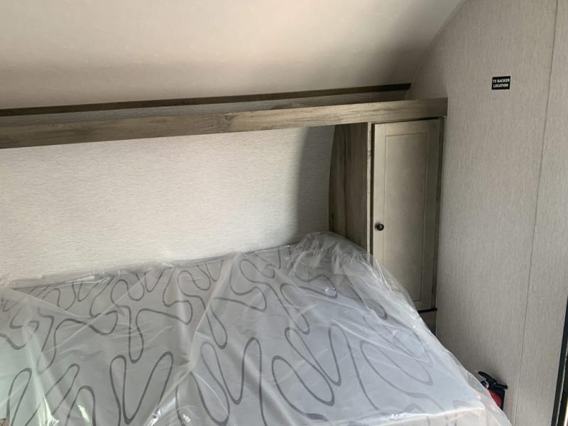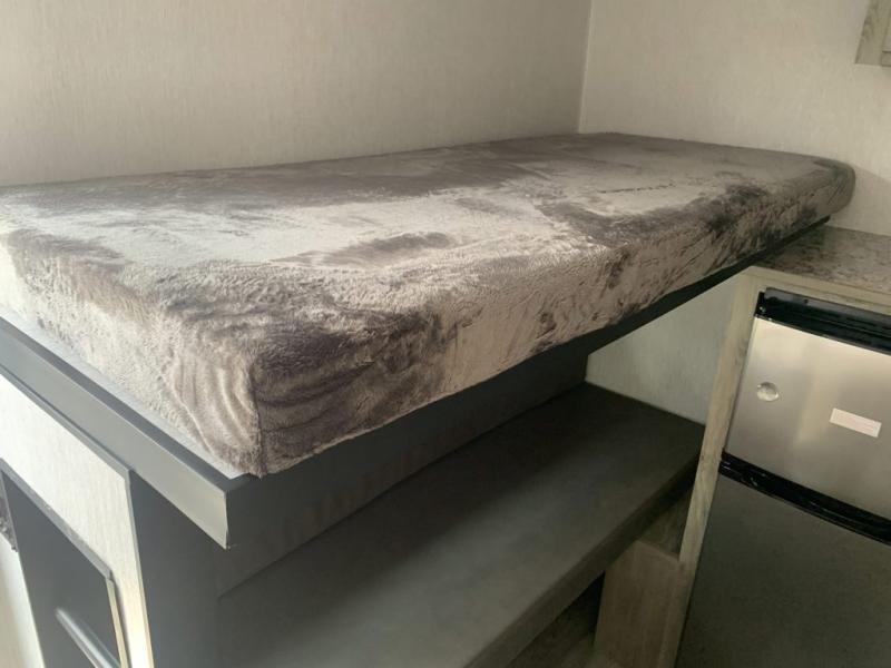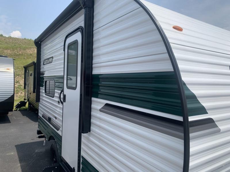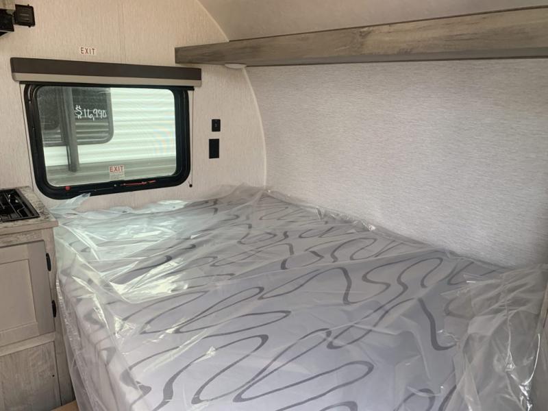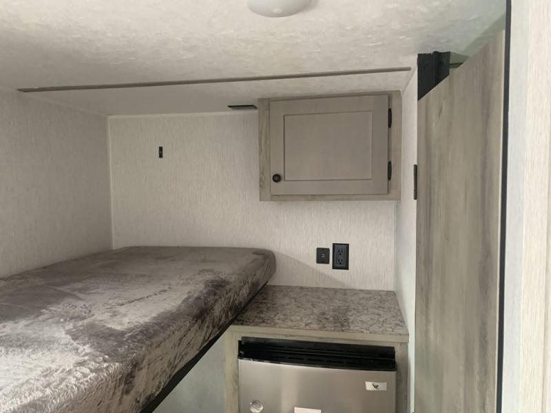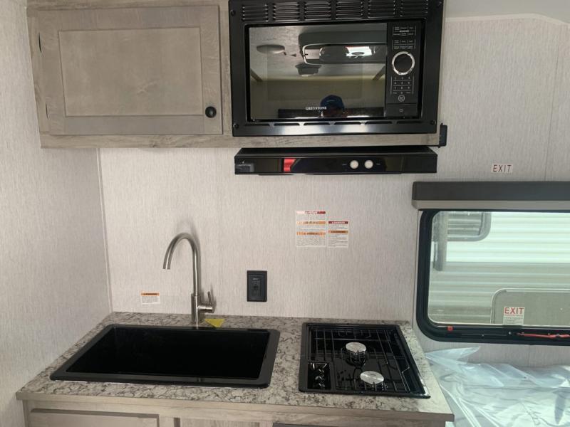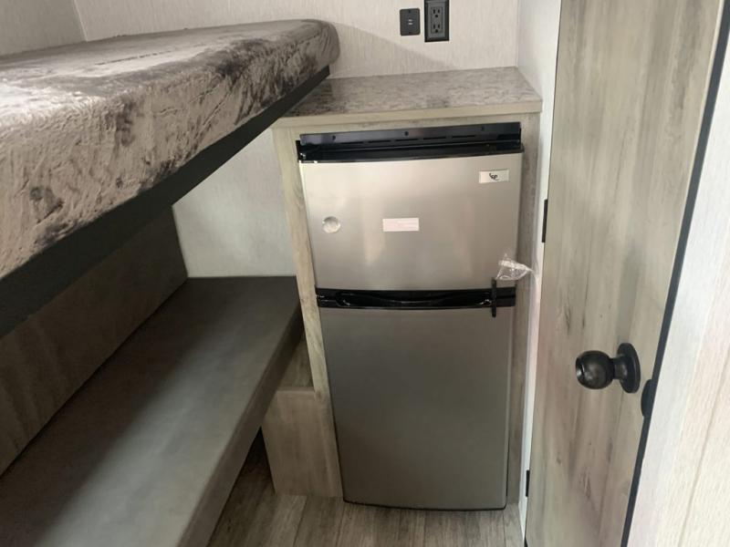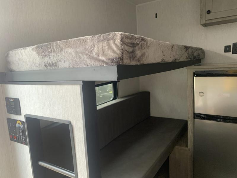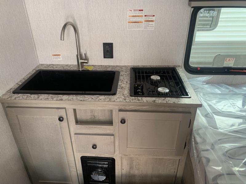 This lightweight travel trailer is perfect for a family of four! You will sleep soundly on the front 54" x 74" bed with an overhead shelf and a closet for your things, and there is a set of bunks along the curbside to the left of the entry door for two more. The top bunk is 24" x 68" with a bottom bunk that is 30" x 68. You can easily cook meals using the two burner cooktop and the double sink is great for cleaning up. The private bath with a 24" x 32" shower and a toilet will let you freshen up each day, and the double sink in the kitchen provides a place to wash your hands and brush your teeth at night. You will also appreciate having a 4.3 cu. ft. 12V refrigerator to keep your food fresh and a 5K BTU wall A/C to keep you comfortable all summer long!
