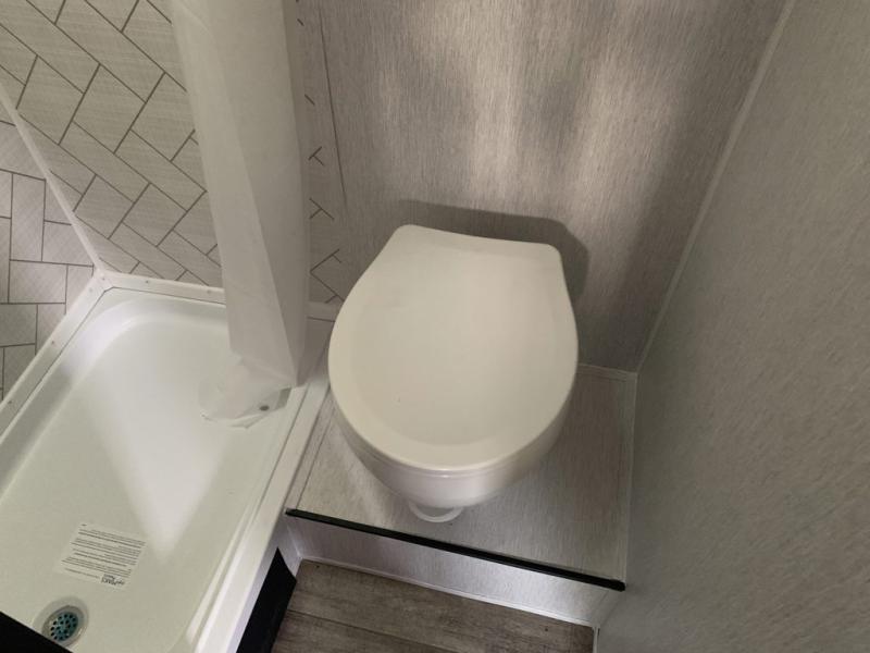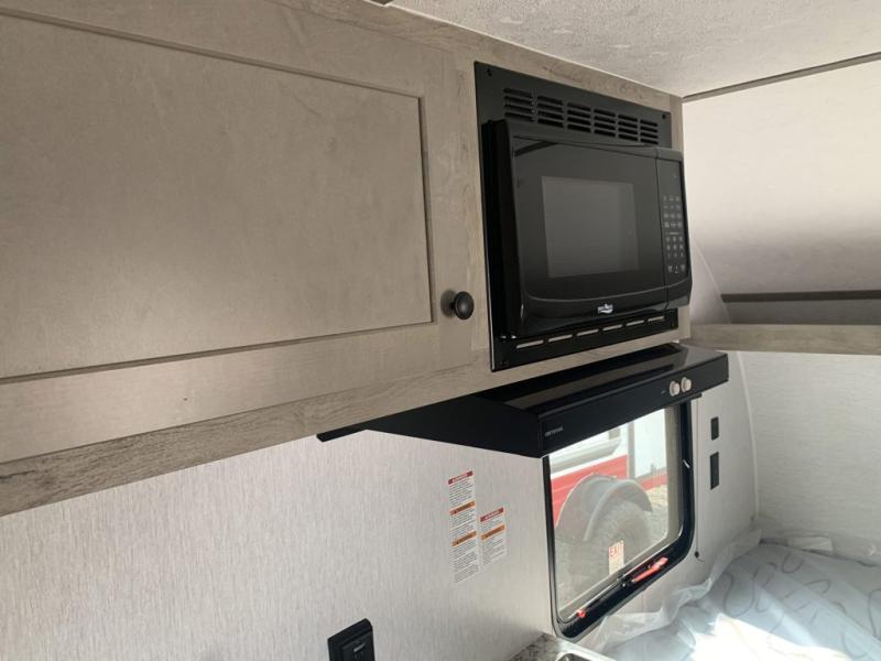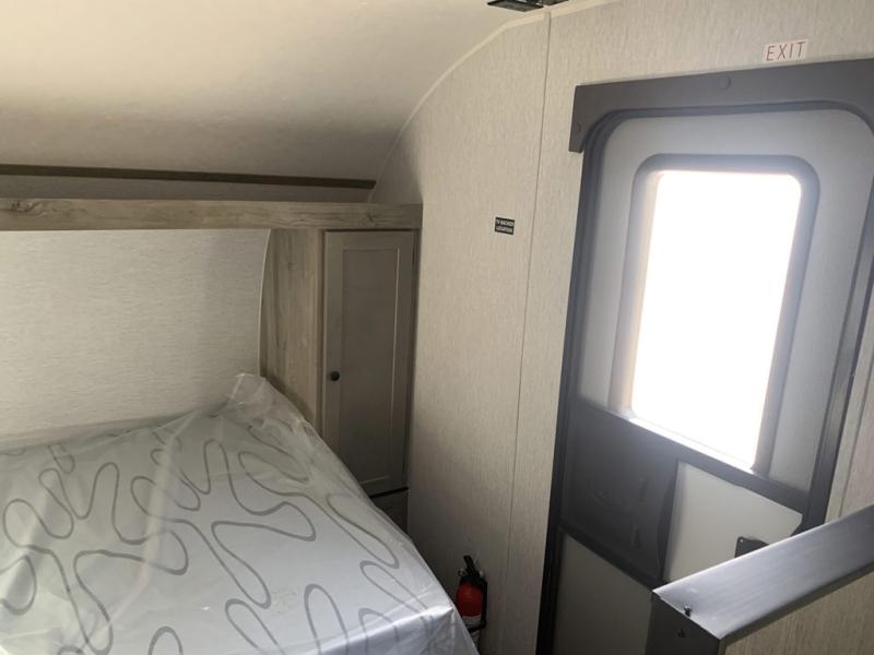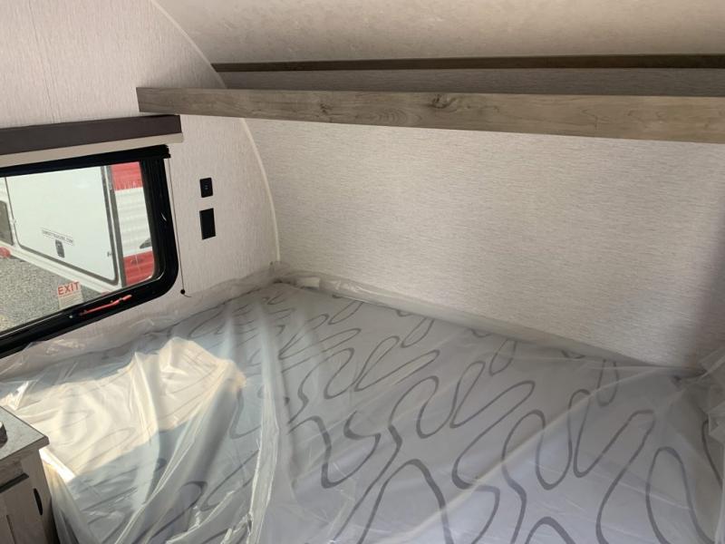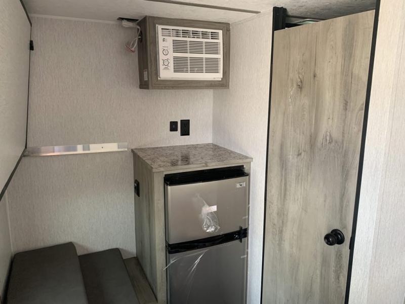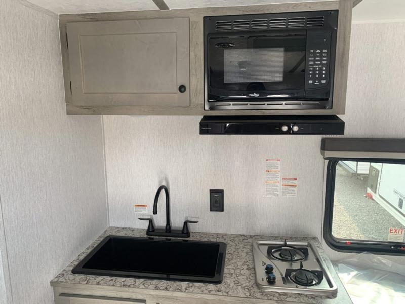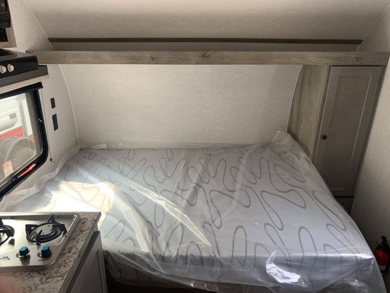 This lightweight travel trailer is perfect for a family of four! You will sleep soundly on the front 54" x 74" bed with an overhead shelf and a closet for your things, and there is a set of bunks along the curbside to the left of the entry door for two more. The top bunk is 24" x 68" with a bottom bunk that is 30" x 68. You can easily cook meals using the two burner cooktop and the double sink is great for cleaning up. The private bath with a 24" x 32" shower and a toilet will let you freshen up each day, and the double sink in the kitchen provides a place to wash your hands and brush your teeth at night. You will also appreciate having a 4.3 cu. ft. 12V refrigerator to keep your food fresh and a 5K BTU wall A/C to keep you comfortable all summer long!