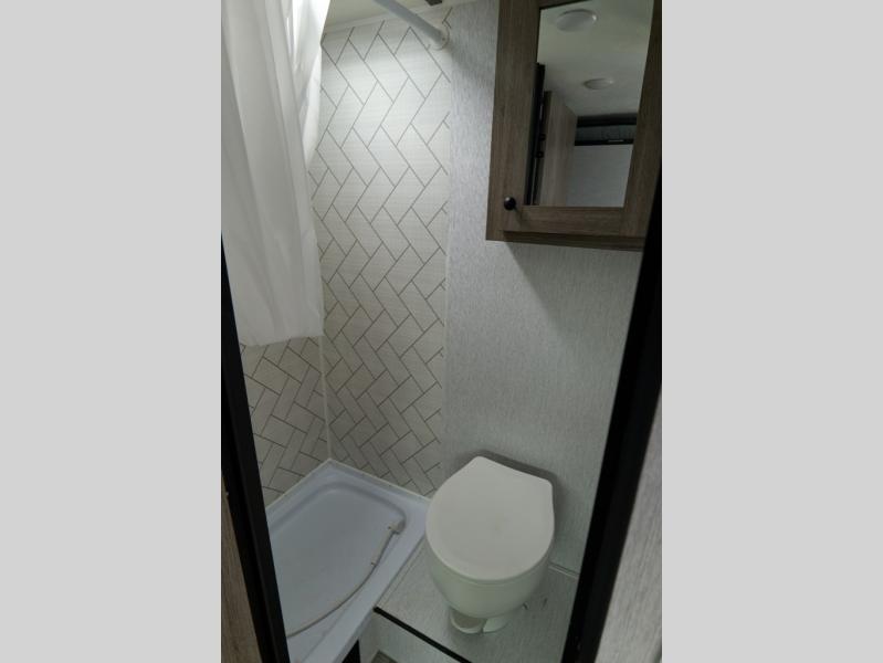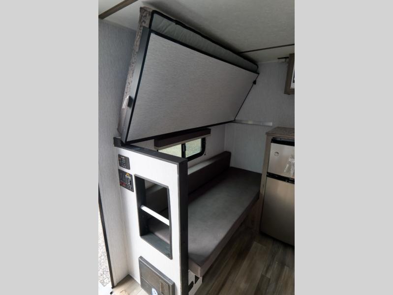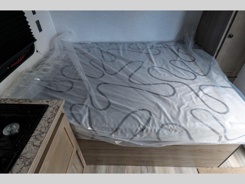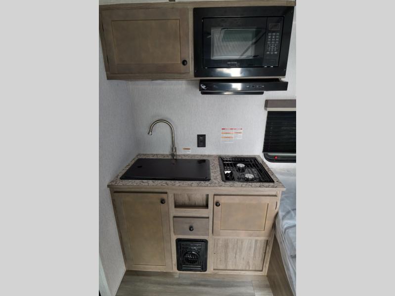 This lightweight travel trailer is perfect for a family of four! You will sleep soundly on the front 54" x 74" bed with an overhead shelf and a closet for your things, and there is a set of bunks along the curbside to the left of the entry door for two more. The top bunk is 24" x 68" with a bottom bunk that is 30" x 68. You can easily cook meals using the two burner cooktop and the double sink is great for cleaning up. The private bath with a 24" x 32" shower and a toilet will let you freshen up each day, and the double sink in the kitchen provides a place to wash your hands and brush your teeth at night. You will also appreciate having a 4.3 cu. ft. 12V refrigerator to keep your food fresh and a 5K BTU wall A/C to keep you comfortable all summer long!