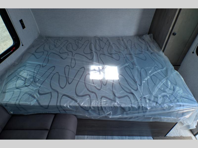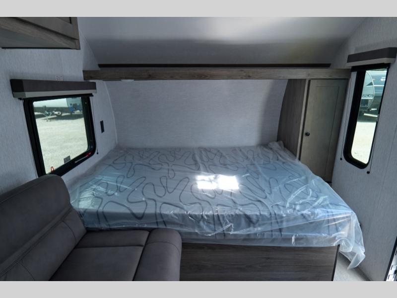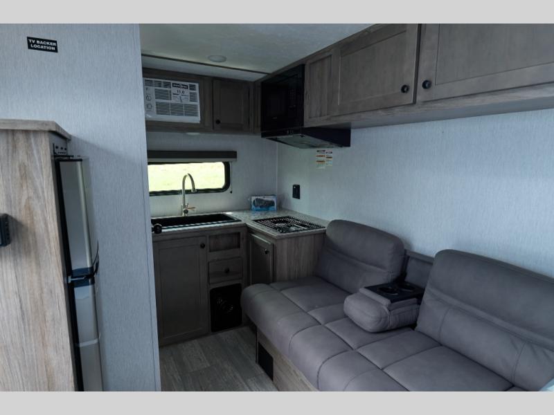 You'll love camping in this cozy trailer! Once you arrive at the campground, you can set up the 9' power awning and head inside to unpack your bags. After you've stretched your legs on a hike, the rear corner private bath with a 24" x 32" shower and a toilet will let you freshen up. You'll find the kitchen in the other rear corner, complete with a two burner cooktop, a double sink, plus counter space to prep meals. When you're ready for some shut-eye, the front 54" x 74" full-size bed will provide a great night's rest, while your guest takes the 56" jiffy sofa!