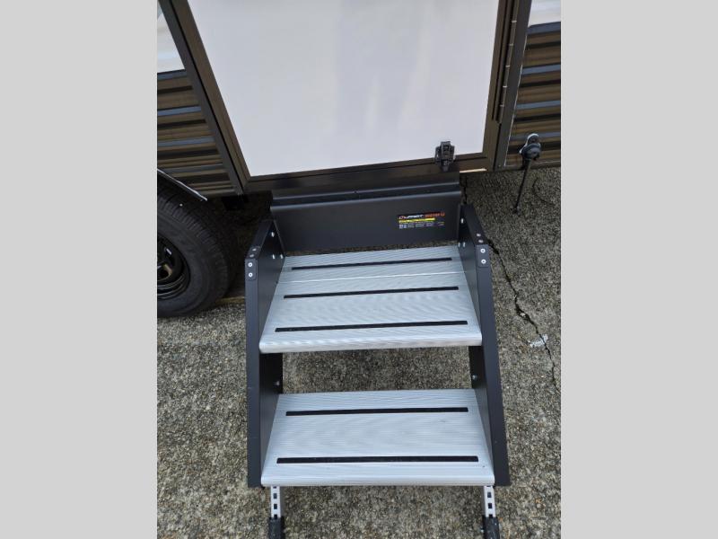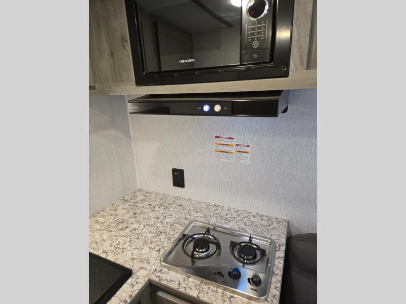 You'll love camping in this cozy trailer! Once you arrive at the campground, you can set up the 9' power awning and head inside to unpack your bags. After you've stretched your legs on a hike, the rear corner private bath with a 24" x 32" shower and a toilet will let you freshen up. You'll find the kitchen in the other rear corner, complete with a two burner cooktop, a double sink, plus counter space to prep meals. When you're ready for some shut-eye, the front 54" x 74" full-size bed will provide a great night's rest, while your guest takes the 56" jiffy sofa!