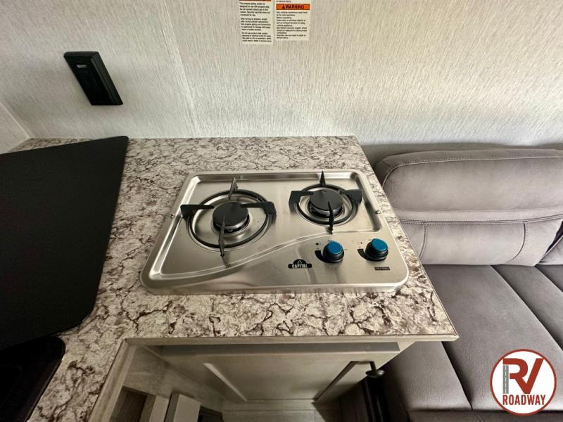 You'll love camping in this cozy trailer! Once you arrive at the campground, you can set up the 9' power awning and head inside to unpack your bags. After you've stretched your legs on a hike, the rear corner private bath with a 24" x 32" shower and a toilet will let you freshen up. You'll find the kitchen in the other rear corner, complete with a two burner cooktop, a double sink, plus counter space to prep meals. When you're ready for some shut-eye, the front 54" x 74" full-size bed will provide a great night's rest, while your guest takes the 56" jiffy sofa!