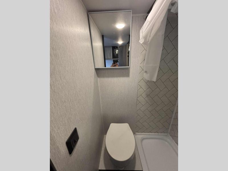 You'll love camping in this cozy trailer! Once you arrive at the campground, you can set up the 9' power awning and head inside to unpack your bags. After you've stretched your legs on a hike, the rear corner private bath with a 24" x 32" shower and a toilet will let you freshen up. You'll find the kitchen in the other rear corner, complete with a two burner cooktop, a double sink, plus counter space to prep meals. When you're ready for some shut-eye, the front 54" x 74" full-size bed will provide a great night's rest, while your guest takes the 56" jiffy sofa!