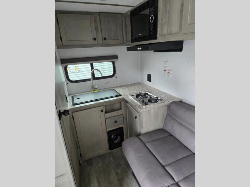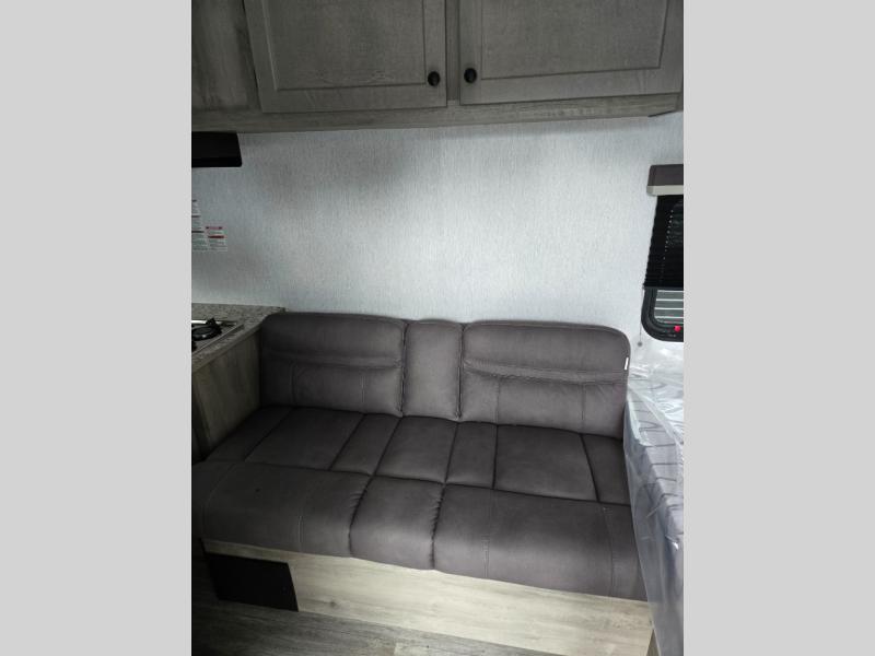 You'll love camping in this cozy trailer! Once you arrive at the campground, you can set up the 9' power awning and head inside to unpack your bags. After you've stretched your legs on a hike, the rear corner private bath with a 24" x 32" shower and a toilet will let you freshen up. You'll find the kitchen in the other rear corner, complete with a two burner cooktop, a double sink, plus counter space to prep meals. When you're ready for some shut-eye, the front 54" x 74" full-size bed will provide a great night's rest, while your guest takes the 56" jiffy sofa!
