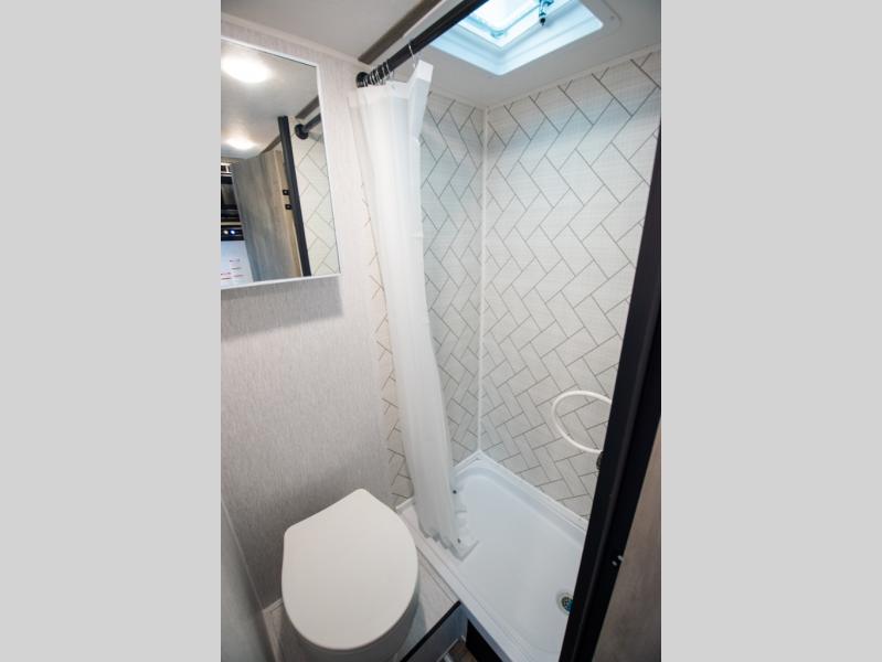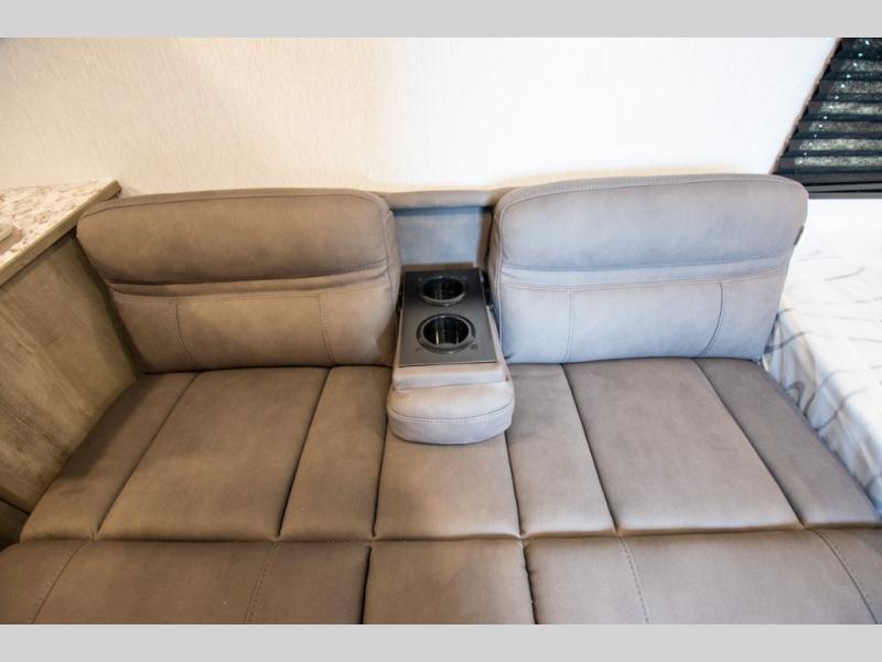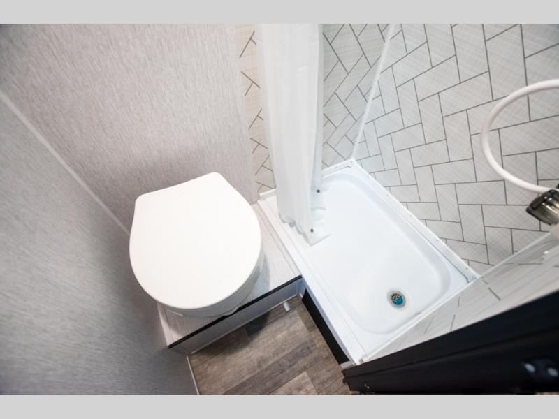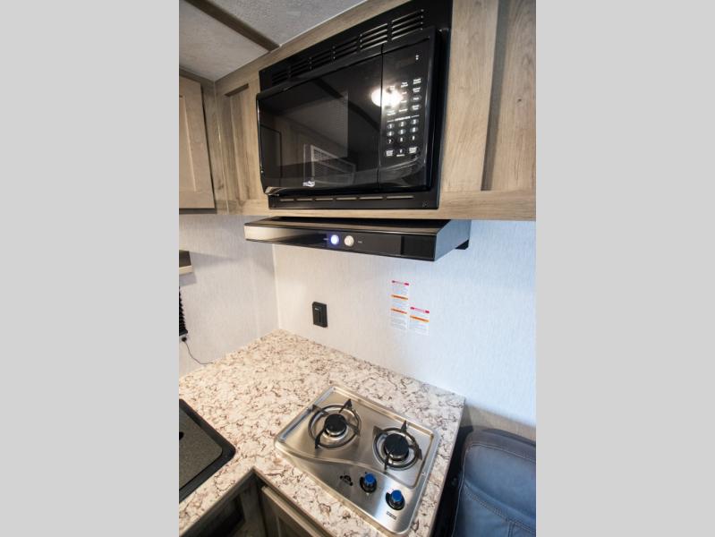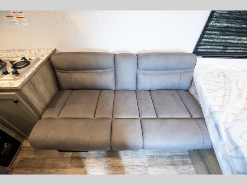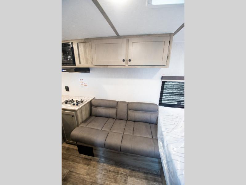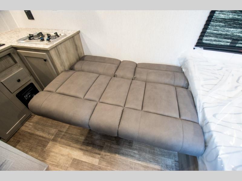 You'll love camping in this cozy trailer! Once you arrive at the campground, you can set up the 9' power awning and head inside to unpack your bags. After you've stretched your legs on a hike, the rear corner private bath with a 24" x 32" shower and a toilet will let you freshen up. You'll find the kitchen in the other rear corner, complete with a two burner cooktop, a double sink, plus counter space to prep meals. When you're ready for some shut-eye, the front 54" x 74" full-size bed will provide a great night's rest, while your guest takes the 56" jiffy sofa!