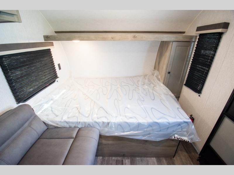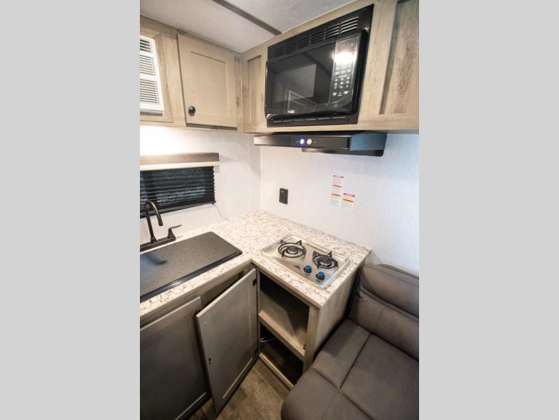 You'll love camping in this cozy trailer! Once you arrive at the campground, you can set up the 9' power awning and head inside to unpack your bags. After you've stretched your legs on a hike, the rear corner private bath with a 24" x 32" shower and a toilet will let you freshen up. You'll find the kitchen in the other rear corner, complete with a two burner cooktop, a double sink, plus counter space to prep meals. When you're ready for some shut-eye, the front 54" x 74" full-size bed will provide a great night's rest, while your guest takes the 56" jiffy sofa!