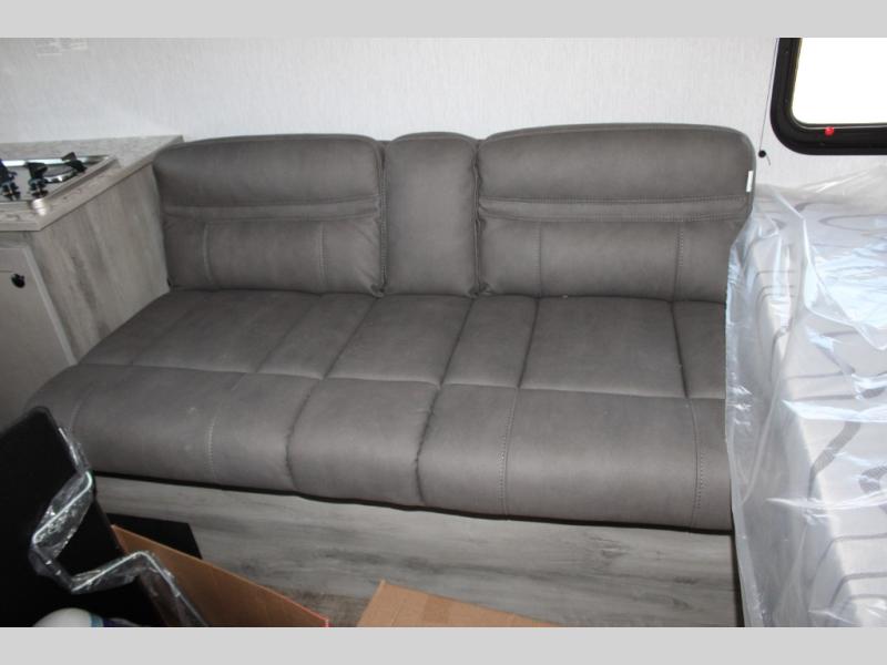 You'll love camping in this cozy trailer! Once you arrive at the campground, you can set up the 9' power awning and head inside to unpack your bags. After you've stretched your legs on a hike, the rear corner private bath with a 24" x 32" shower and a toilet will let you freshen up. You'll find the kitchen in the other rear corner, complete with a two burner cooktop, a double sink, plus counter space to prep meals. When you're ready for some shut-eye, the front 54" x 74" full-size bed will provide a great night's rest, while your guest takes the 56" jiffy sofa!