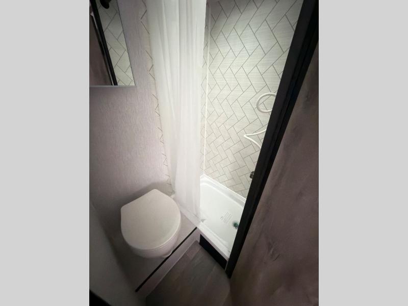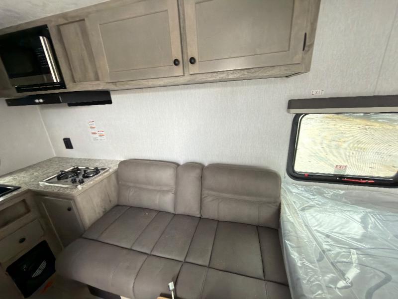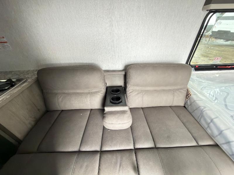 You'll love camping in this cozy trailer! Once you arrive at the campground, you can set up the 9' power awning and head inside to unpack your bags. After you've stretched your legs on a hike, the rear corner private bath with a 24" x 32" shower and a toilet will let you freshen up. You'll find the kitchen in the other rear corner, complete with a two burner cooktop, a double sink, plus counter space to prep meals. When you're ready for some shut-eye, the front 54" x 74" full-size bed will provide a great night's rest, while your guest takes the 56" jiffy sofa!