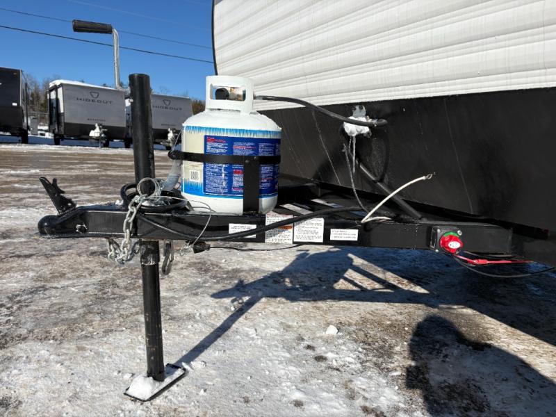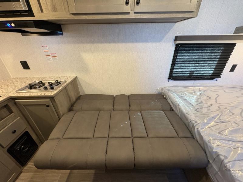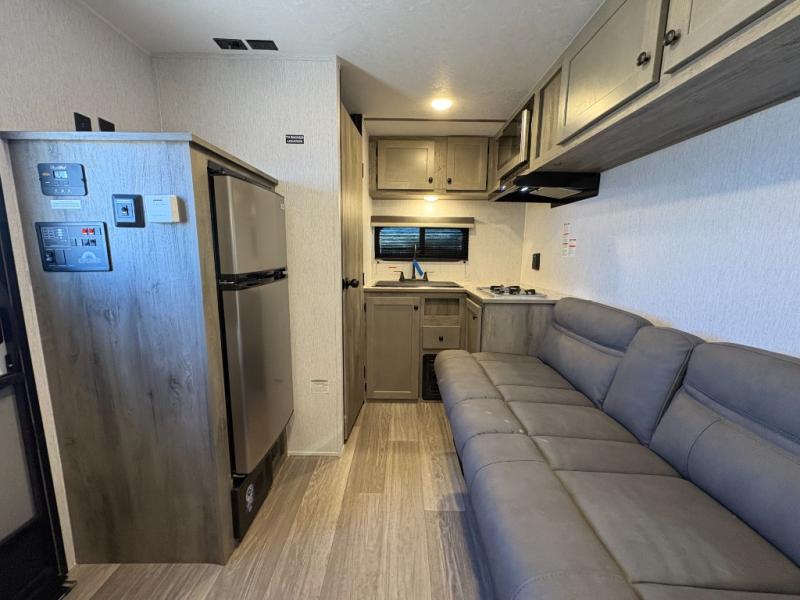 You'll love camping in this cozy trailer! Once you arrive at the campground, you can set up the 9' power awning and head inside to unpack your bags. After you've stretched your legs on a hike, the rear corner private bath with a 24" x 32" shower and a toilet will let you freshen up. You'll find the kitchen in the other rear corner, complete with a two burner cooktop, a double sink, plus counter space to prep meals. When you're ready for some shut-eye, the front 54" x 74" full-size bed will provide a great night's rest, while your guest takes the 56" jiffy sofa!