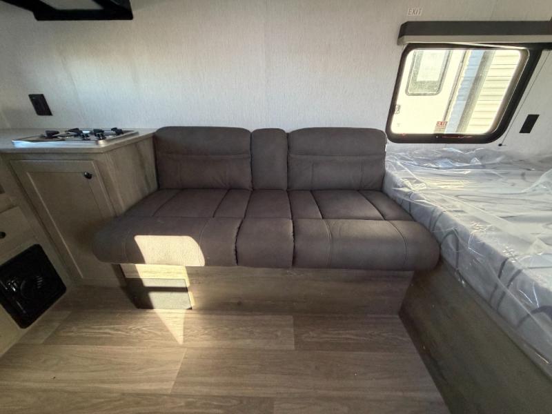 You'll love camping in this cozy trailer! Once you arrive at the campground, you can set up the 9' power awning and head inside to unpack your bags. After you've stretched your legs on a hike, the rear corner private bath with a 24" x 32" shower and a toilet will let you freshen up. You'll find the kitchen in the other rear corner, complete with a two burner cooktop, a double sink, plus counter space to prep meals. When you're ready for some shut-eye, the front 54" x 74" full-size bed will provide a great night's rest, while your guest takes the 56" jiffy sofa!